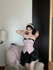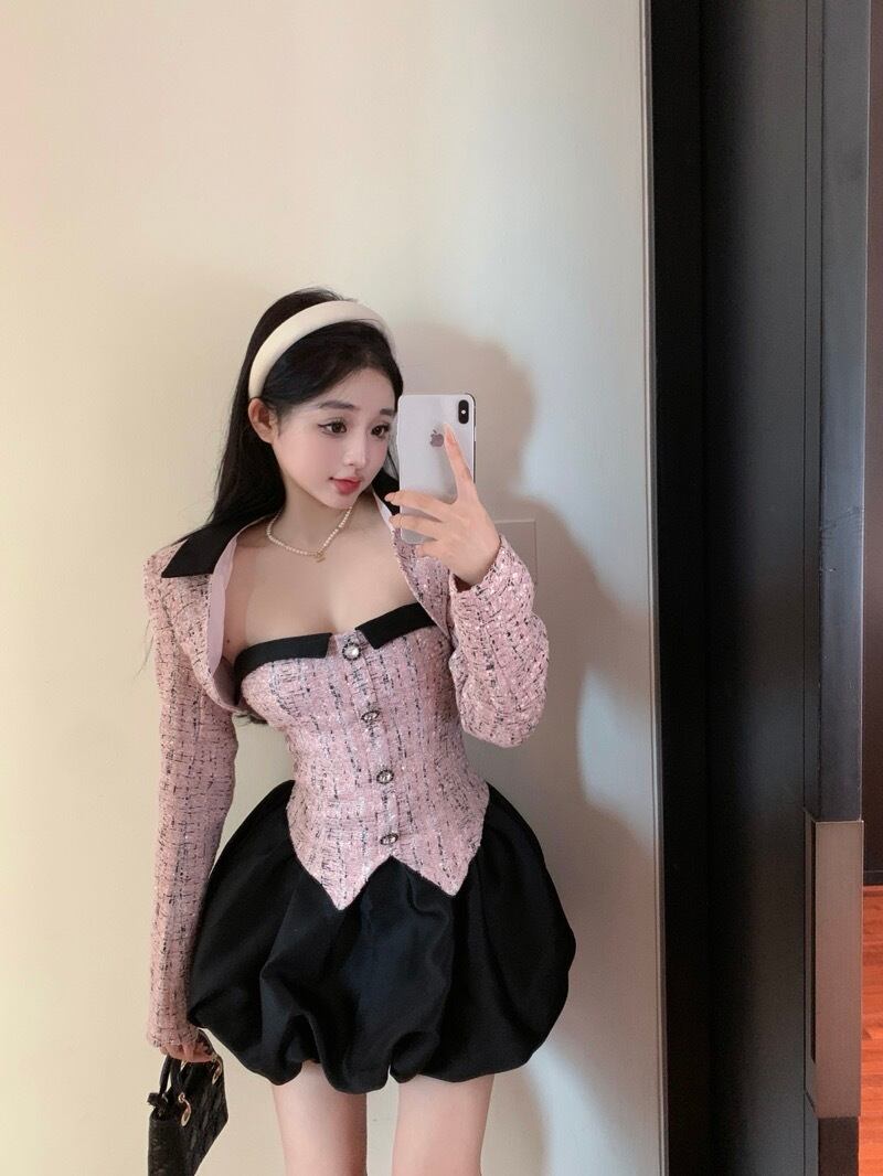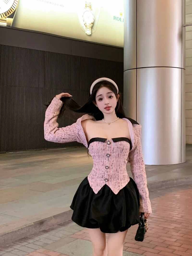 スイートガールスーツ秋スリムフィットストラップレスドレス長袖ショートコートツーピースセット服 ロング 大人ガーリー スウィート キュート カジュアル オータム 秋物