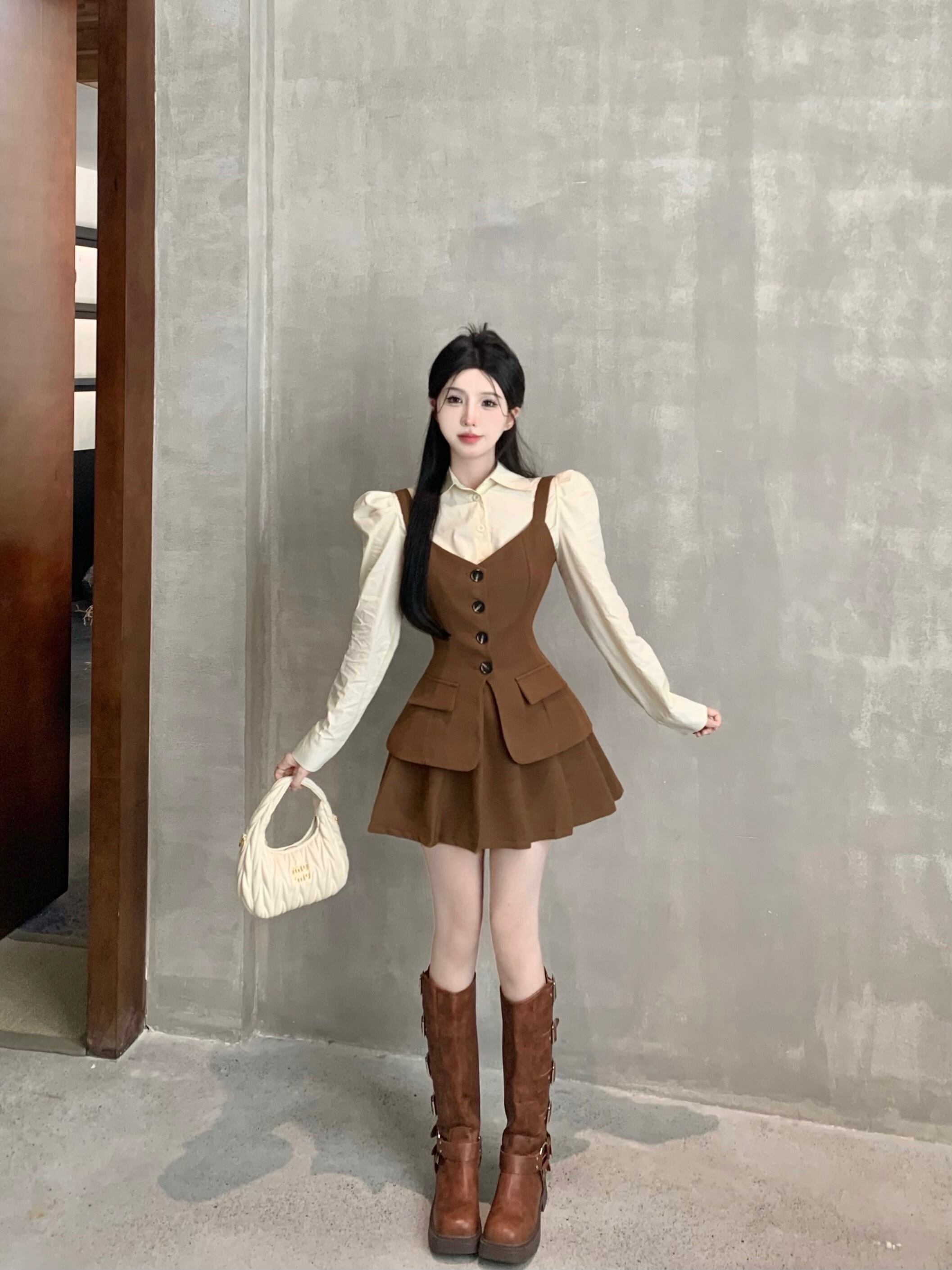 オフィスレディ スーツ レディース 秋 バブルスリーブ シャツ シングルブレスト ストラップベスト プリーツスカート 3点セット オータム 秋物 会社 学校 通勤や通学にも