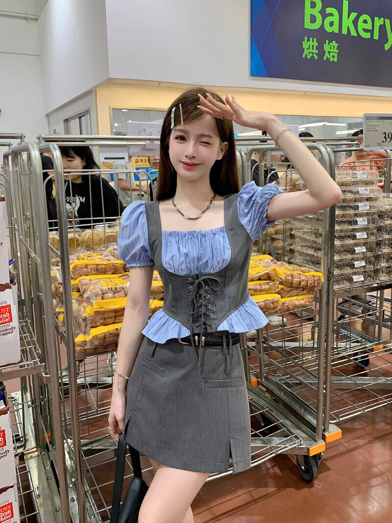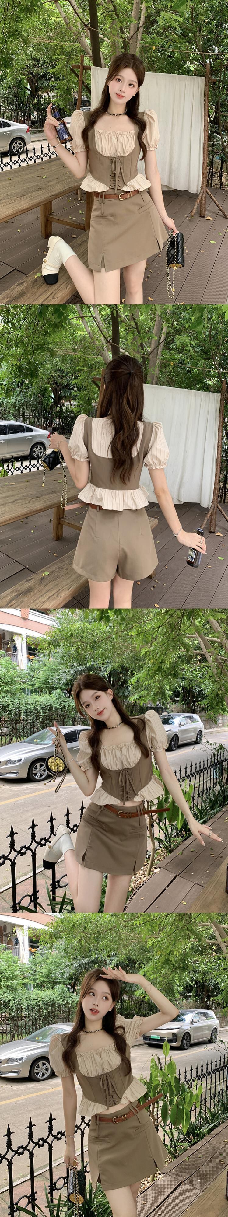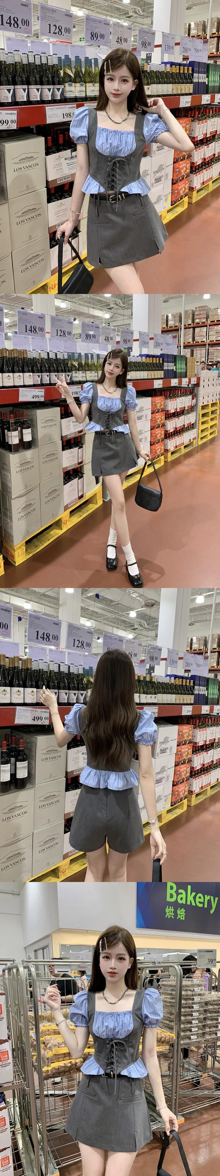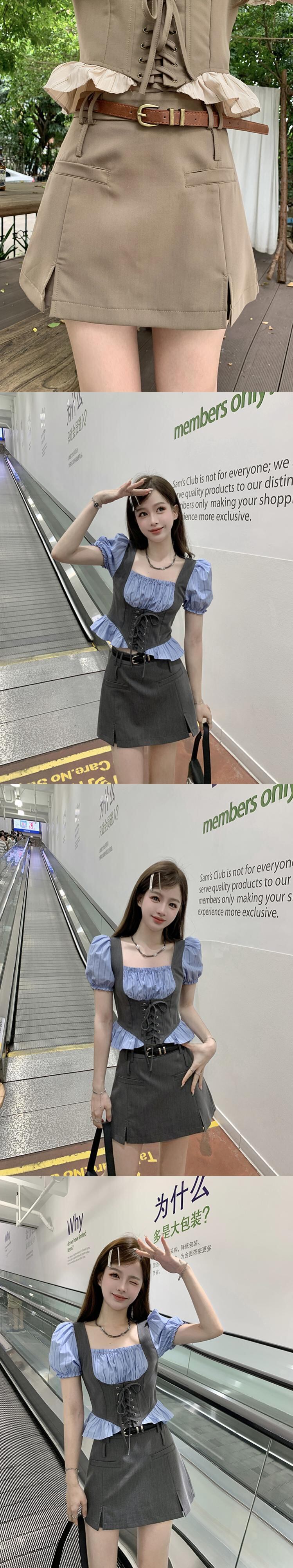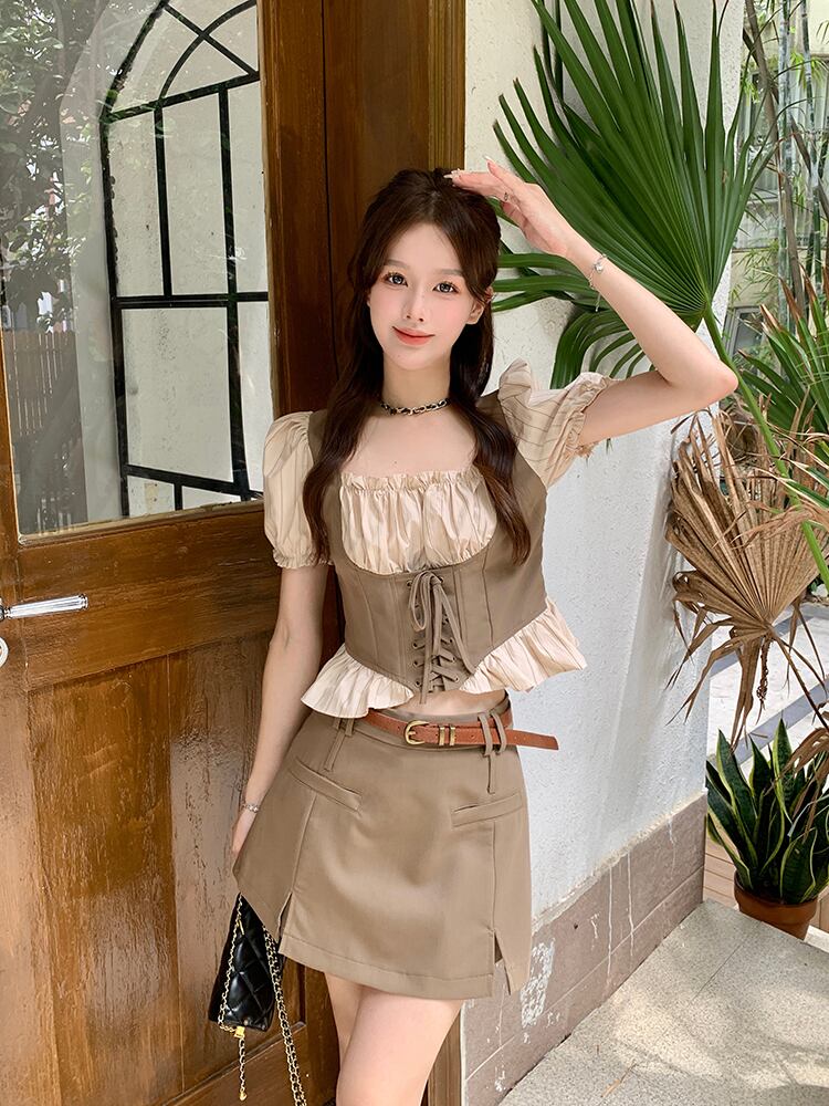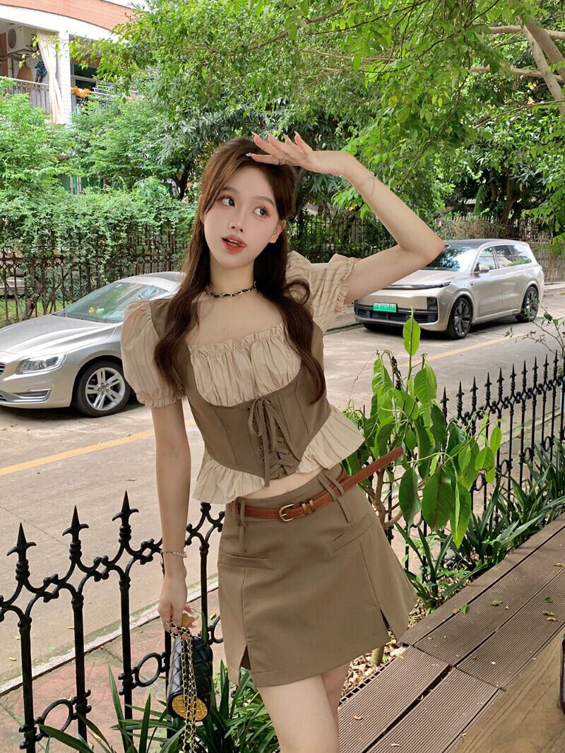 甘いホットガールスーツ夏レトロスクエアカラーシャツウエスト A ラインスプリットスカート 2 点セット服 大人ガーリー スウィート キュート カジュアル サマー 夏物 Aライン スクウェア