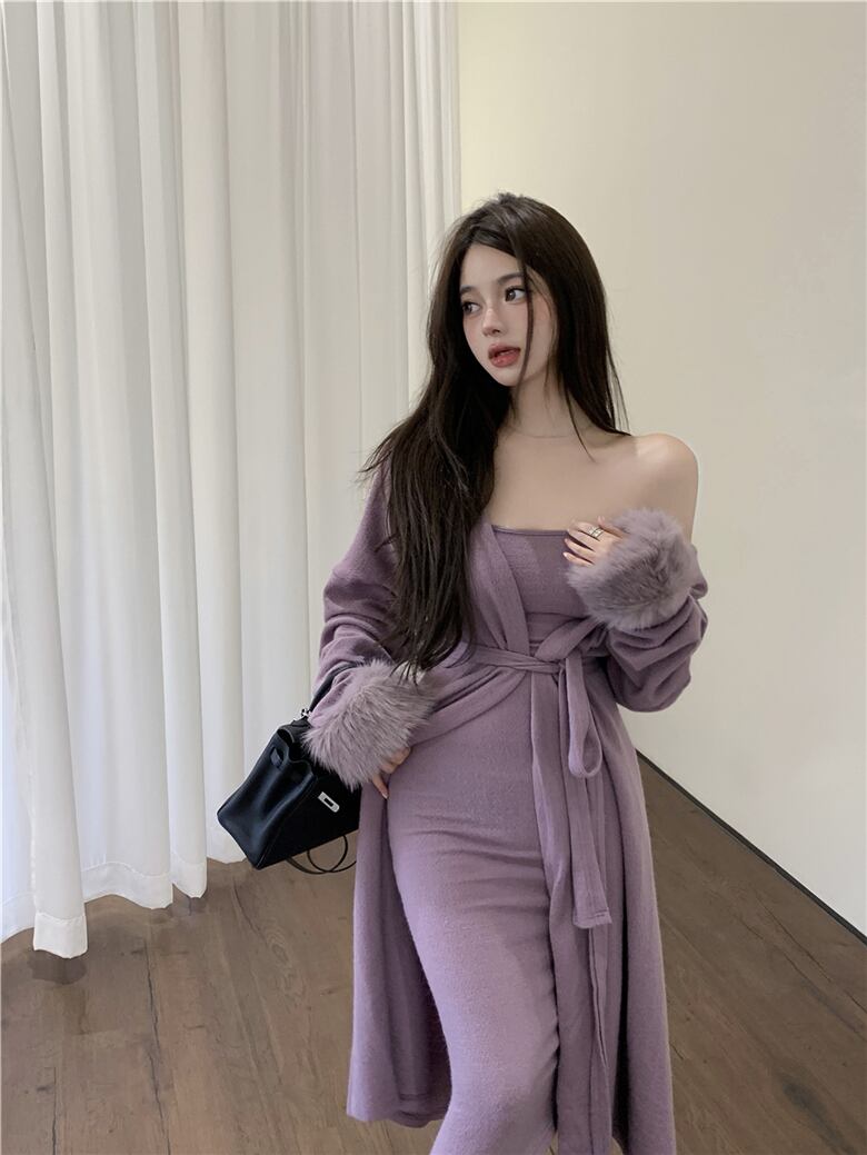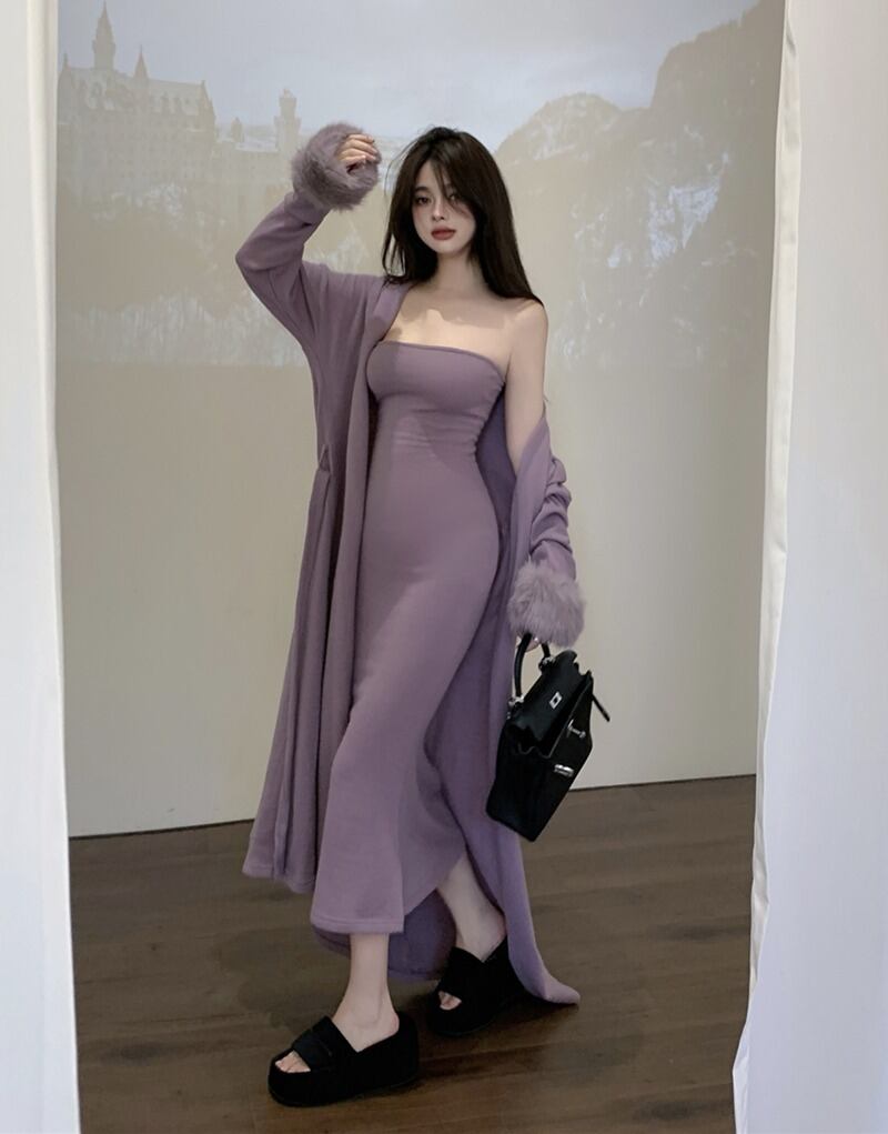 甘いホットガールスーツ秋ストラップレスドレス豪華袖ウエストバンドカーディガンジャケット 2 点セット服 大人ガーリー スウィート キュート カジュアル オータム 秋物