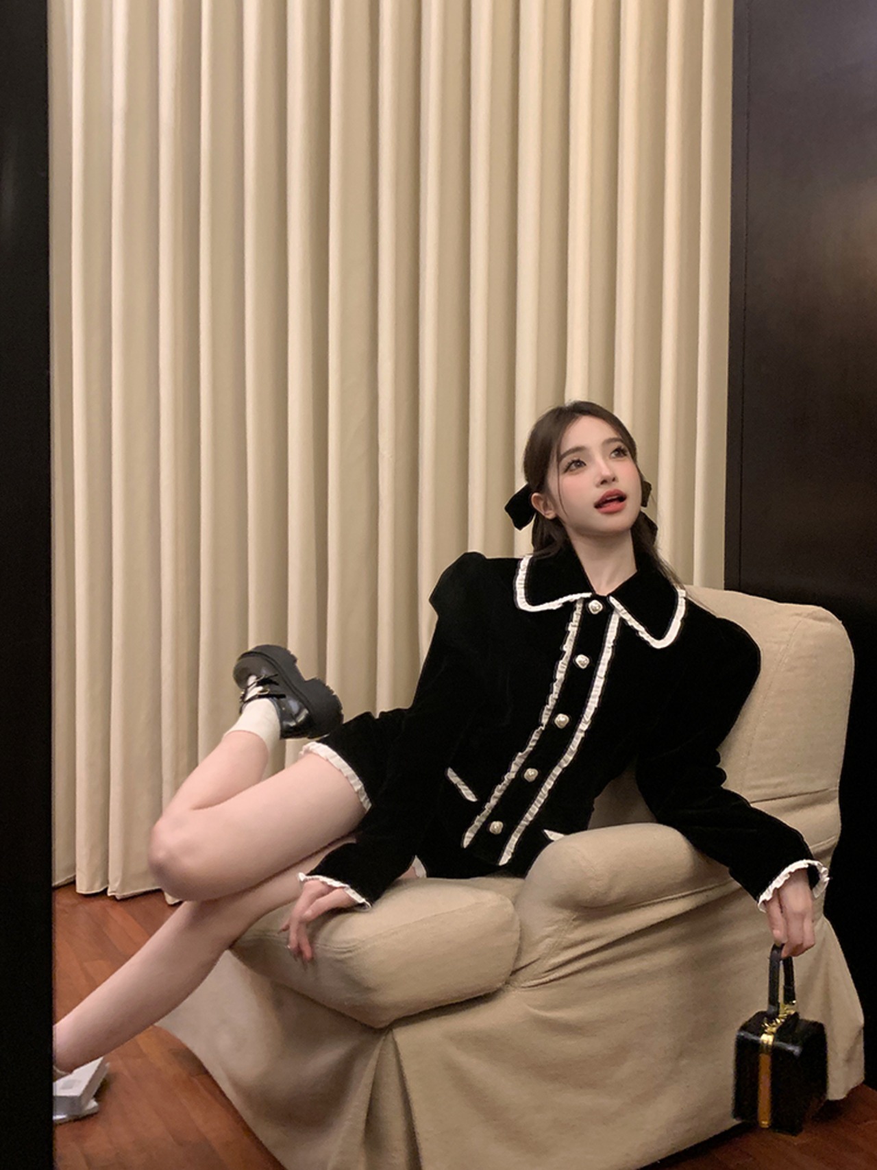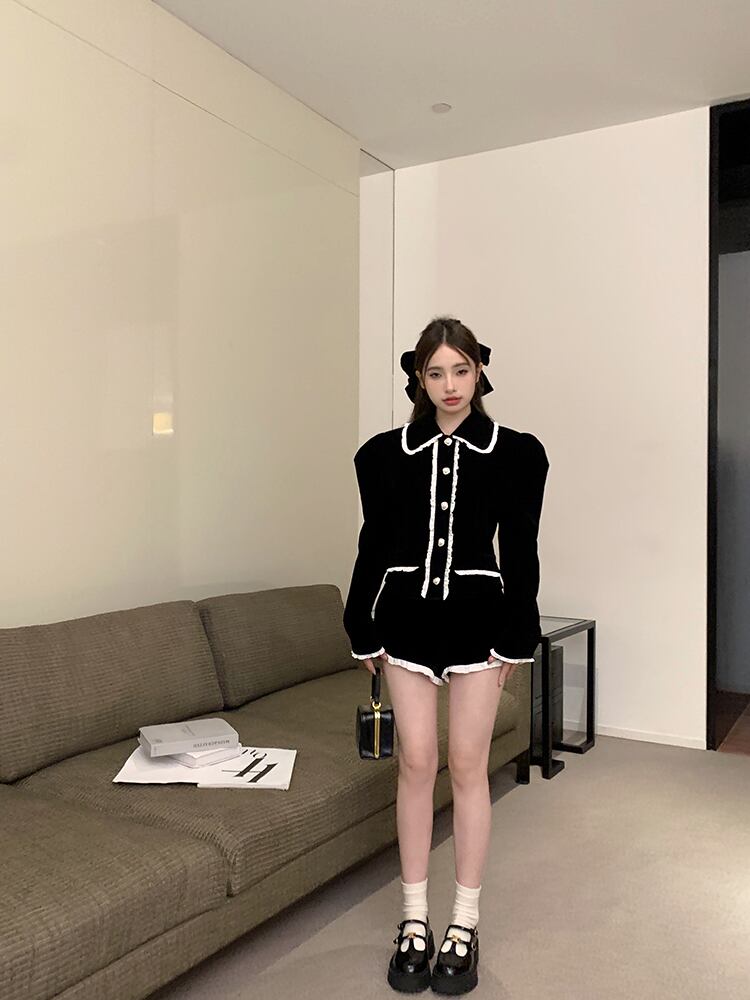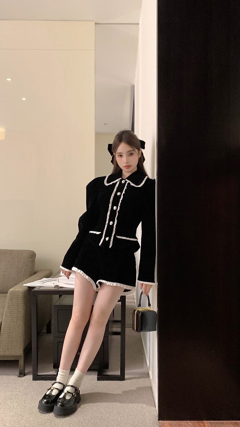 甘いホットスーツ秋長袖ショートコートトップウエストショーツ黒ベルベット 2 点セット服 ロング ブラック 大人ガーリー スウィート キュート カジュアル オータム 秋物 ブルマー