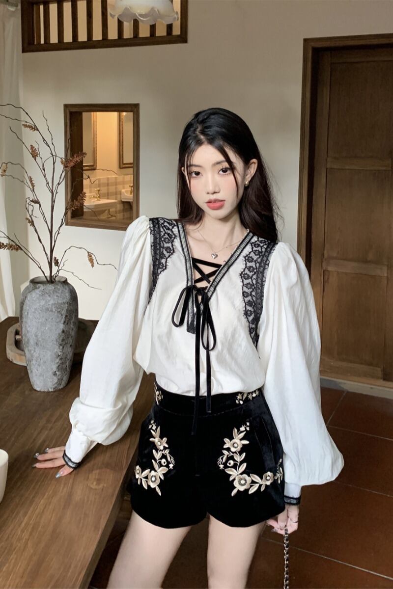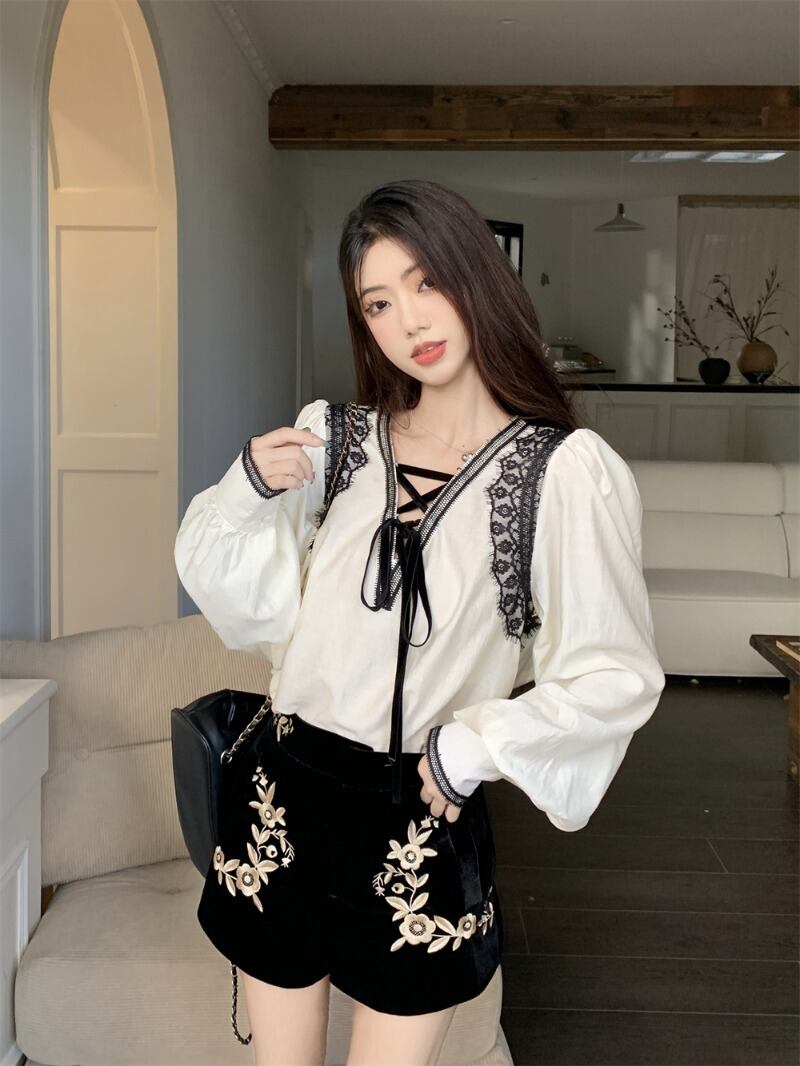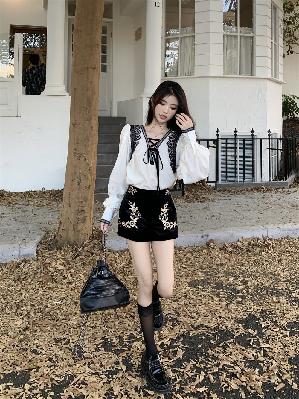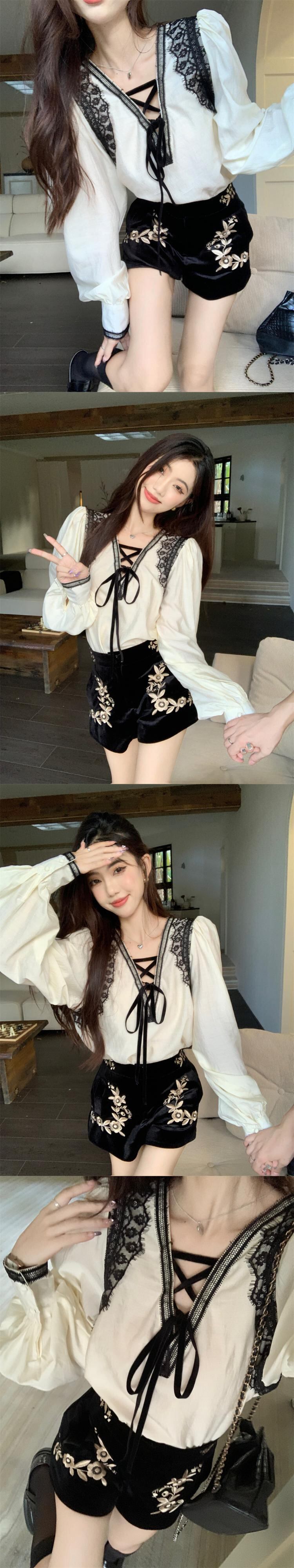 中国風スーツ秋レースパッチワーク長袖シャツ刺繍ショートパンツ 2 点セット服 ロング レッド オータム 秋物