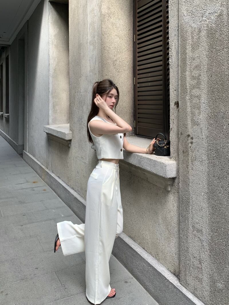 スイートホットガールスーツ夏ラウンドネックノースリーブベストウエストワイドレッグロングパンツ 2 点セット服 大人ガーリー スウィート キュート カジュアル サマー 夏物 Oネック ワイドパンツ