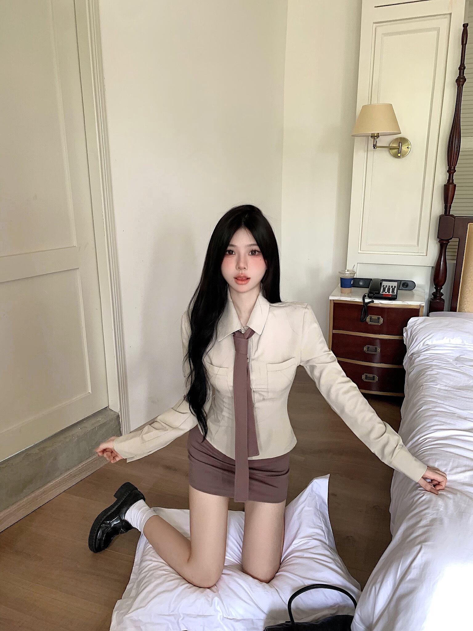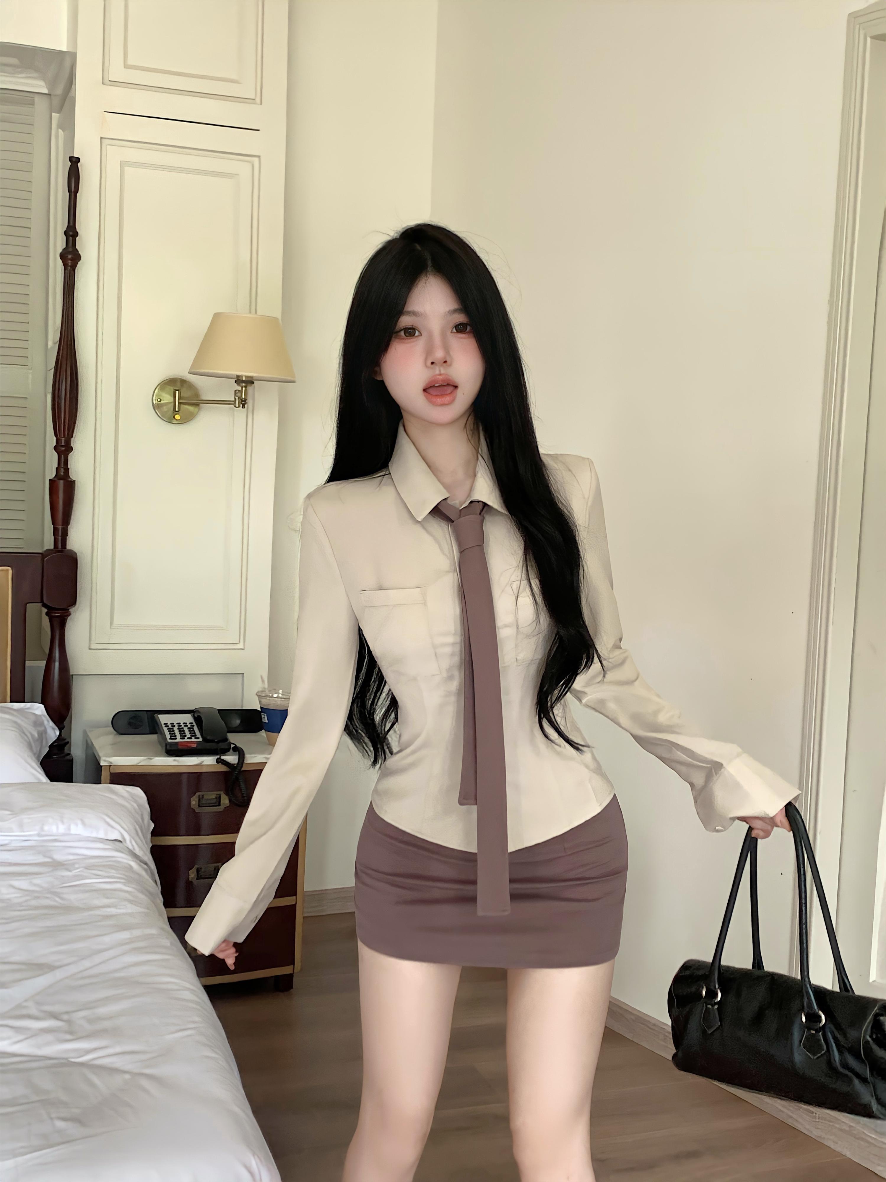 アメリカ純粋セクシースーツ秋スリムフィットシャツネクタイウエストラップヒップショートスカートツーピースセット服 オータム 秋物 ピュア