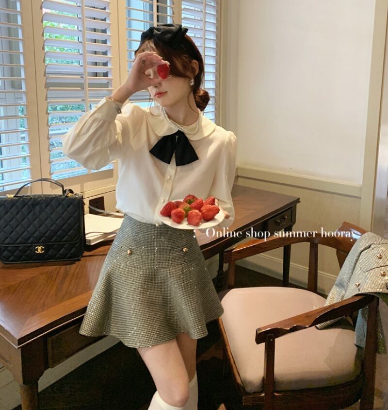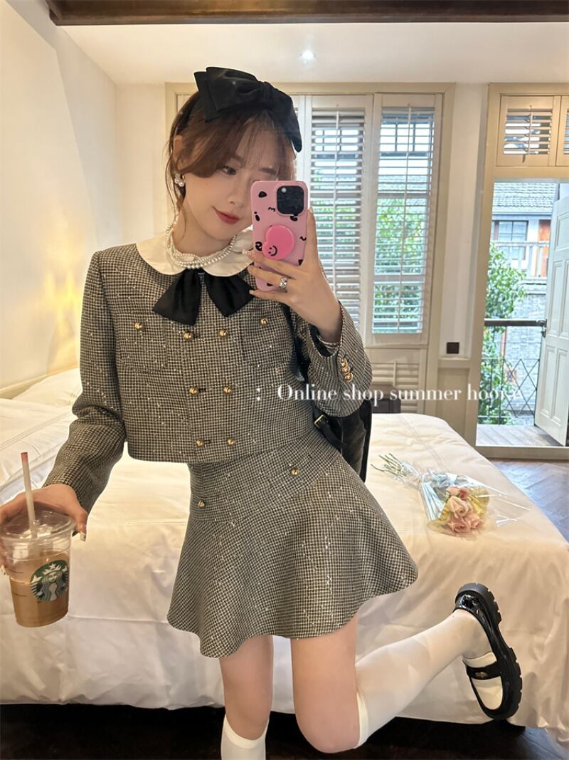 甘いホットガールスーツ秋白シャツスパンコールチェック柄ジャケット A ラインミニスカート 3 点セット服 ホワイト 大人ガーリー スウィート キュート カジュアル オータム 秋物 Aライン