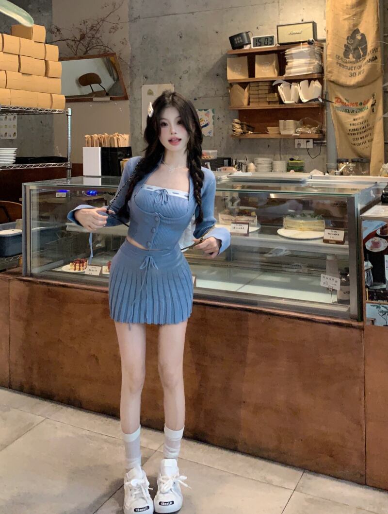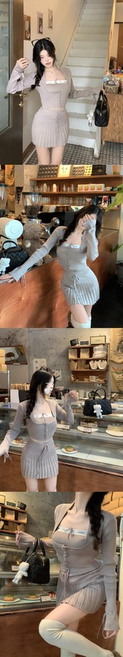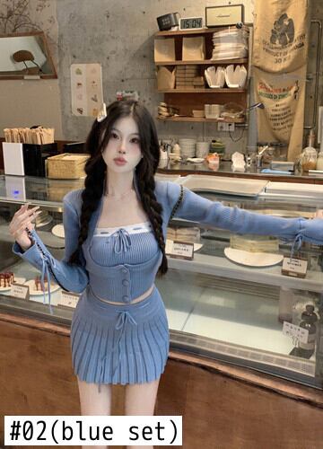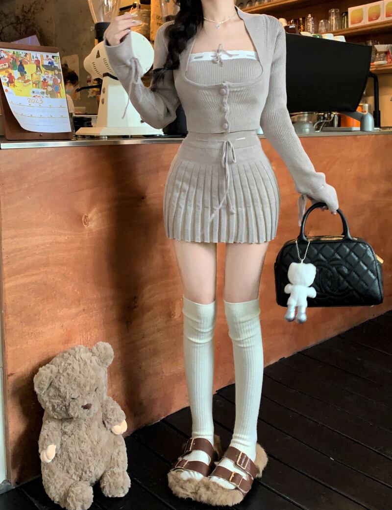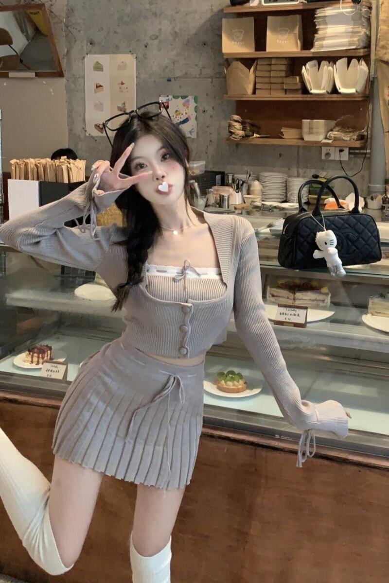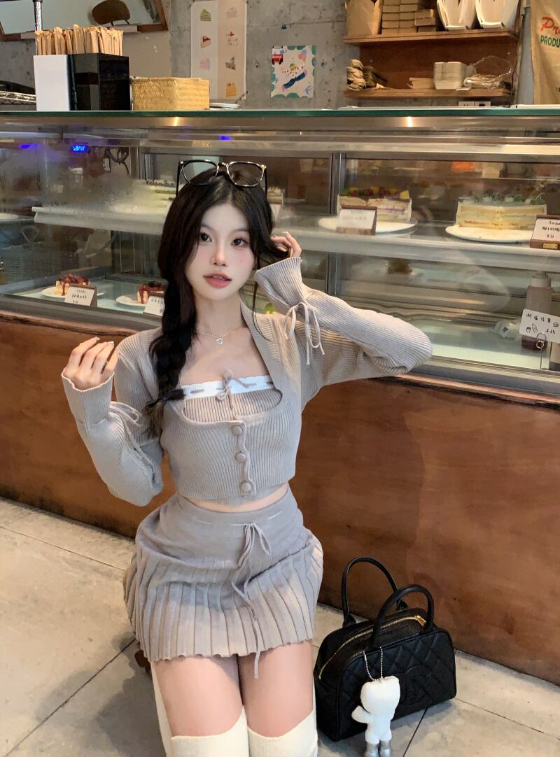 ホットガールズスーツ秋コントラストニットカーディガンスリムキャミソールプリーツミニスカート 3 点セット服 オータム 秋物