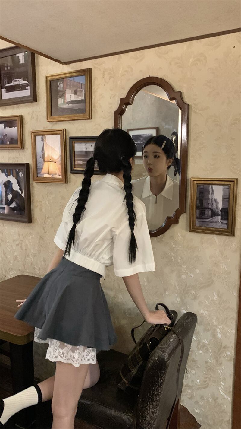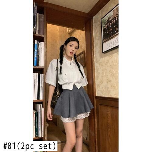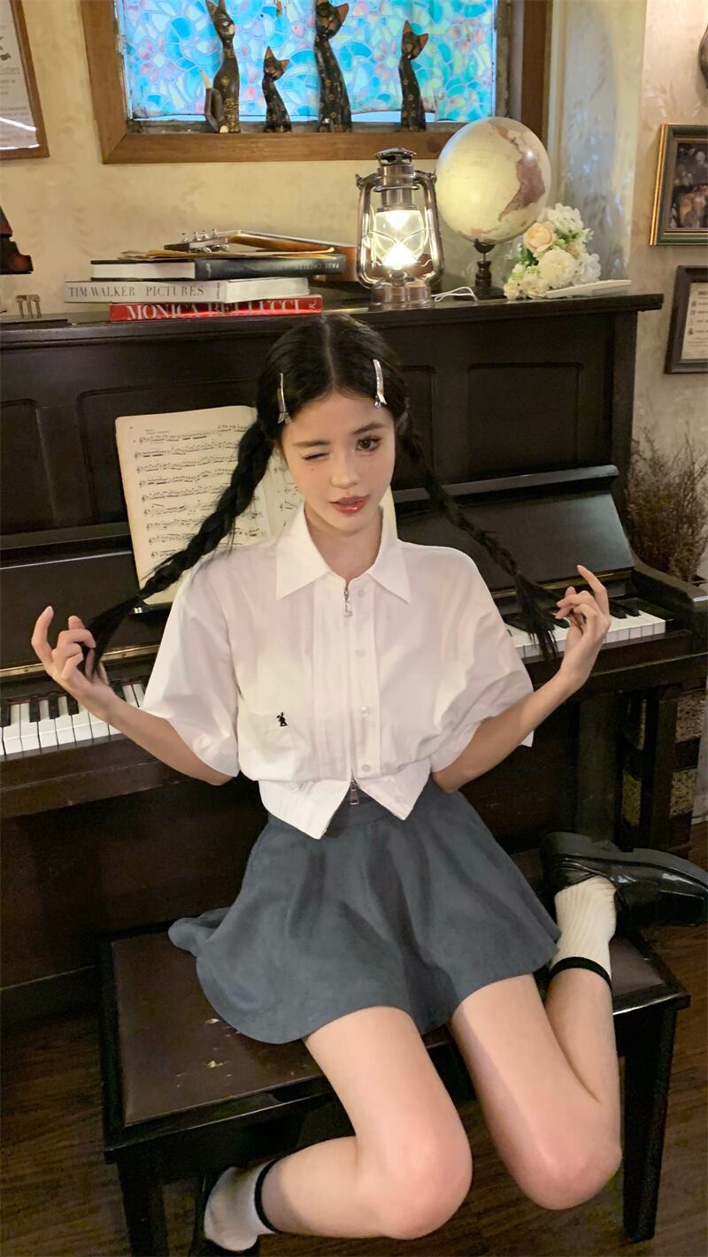 ホットガールスーツ夏白ダブルヘッドジッパー半袖シャツトップウエスト A ラインスカートショーツ 2 点セット ホワイト レッド サマー 夏物 ブルマー Aライン