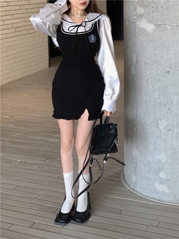 プレッピースタイルスーツ夏セーラーカラーシャツ黒ラップヒップストラップドレスツーピースセット服 ブラック サマー 夏物