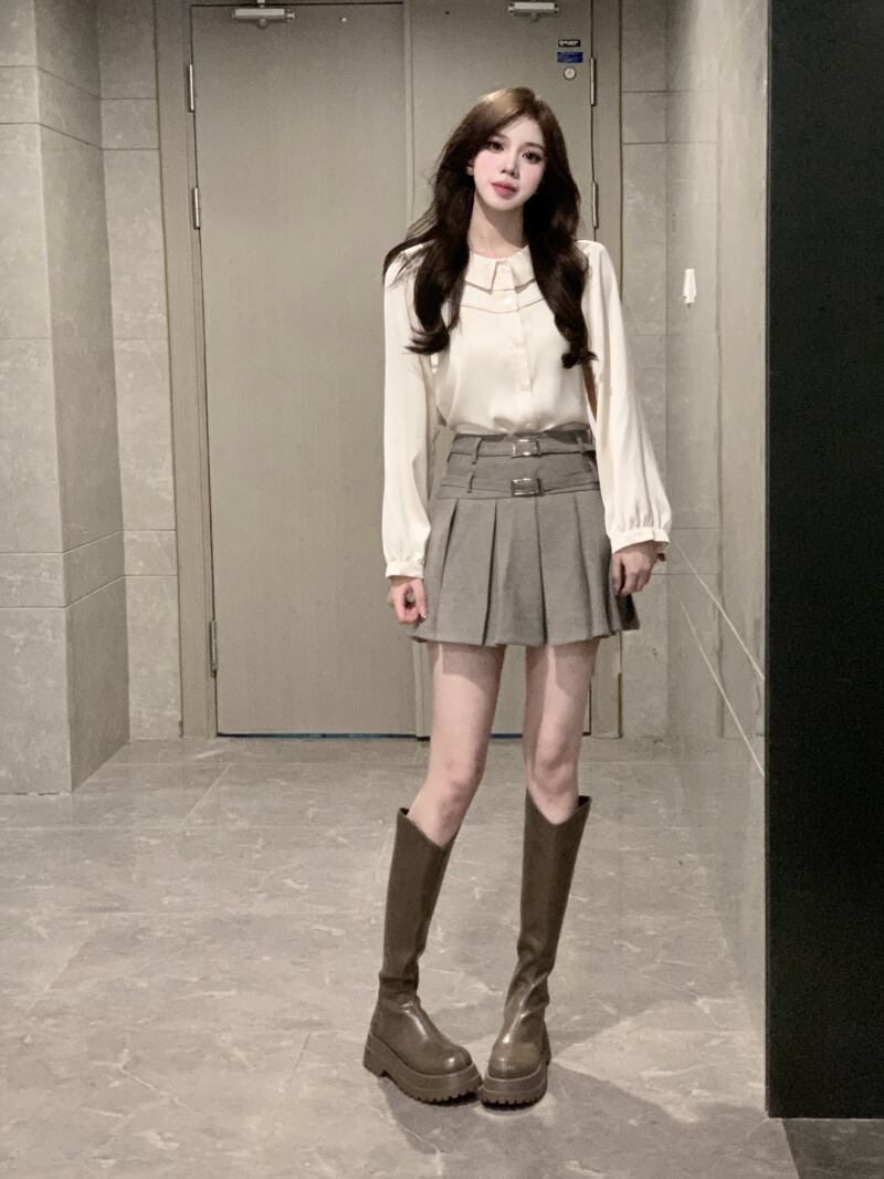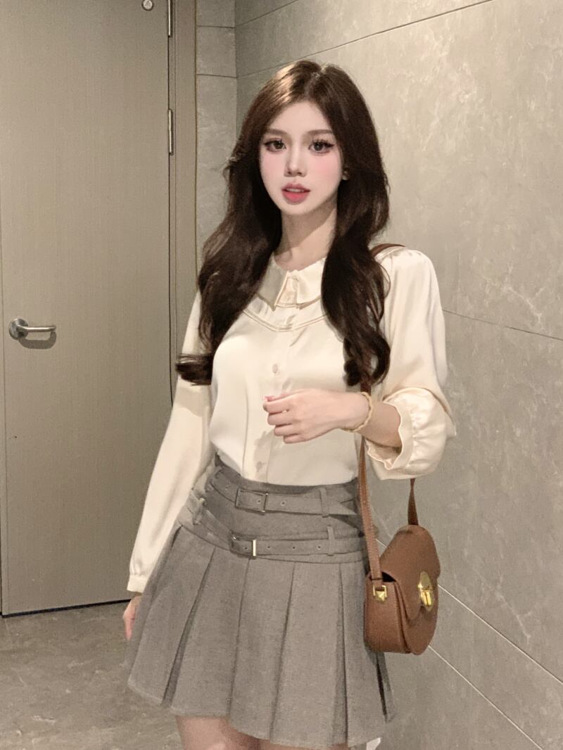 ホットガールスタイルスーツ秋ターンダウンカラーコートウエストプリーツショートスカートランタンサテンシャツ 2 点セット オータム 秋物