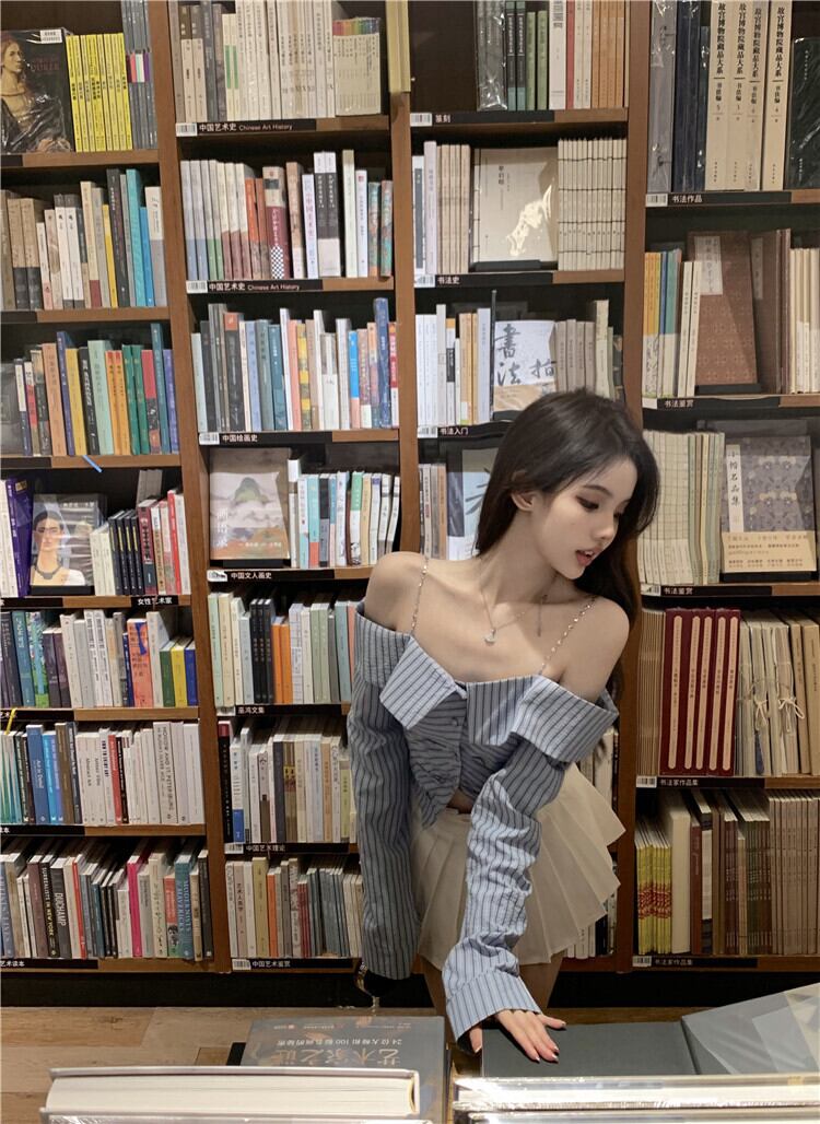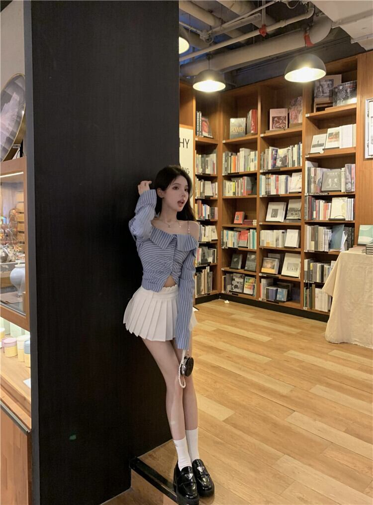 ホットガールスーツ秋ストライプオフショルダー不規則シャツ白プリーツスカートツーピースセット服 ホワイト オータム 秋物