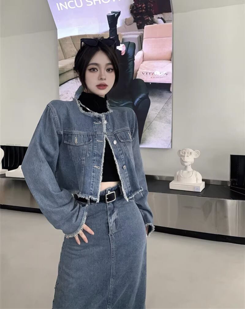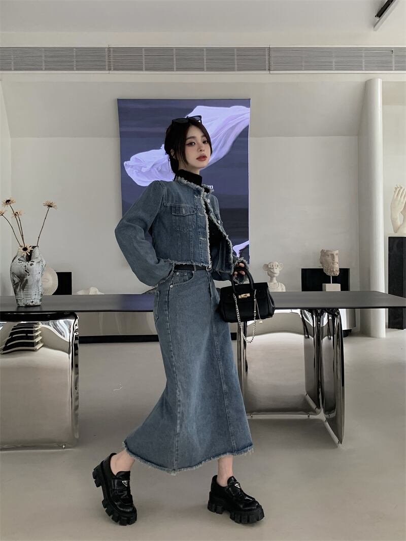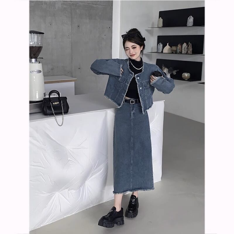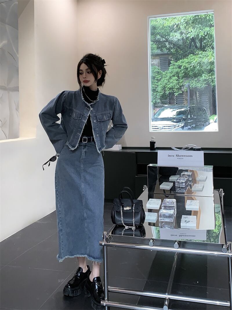 ホットガールスーツ レディース 秋フリース ラウンドネック ショートデニムコート ウエスト 万能ロングスカート 2点セット オータム 秋物 Oネック