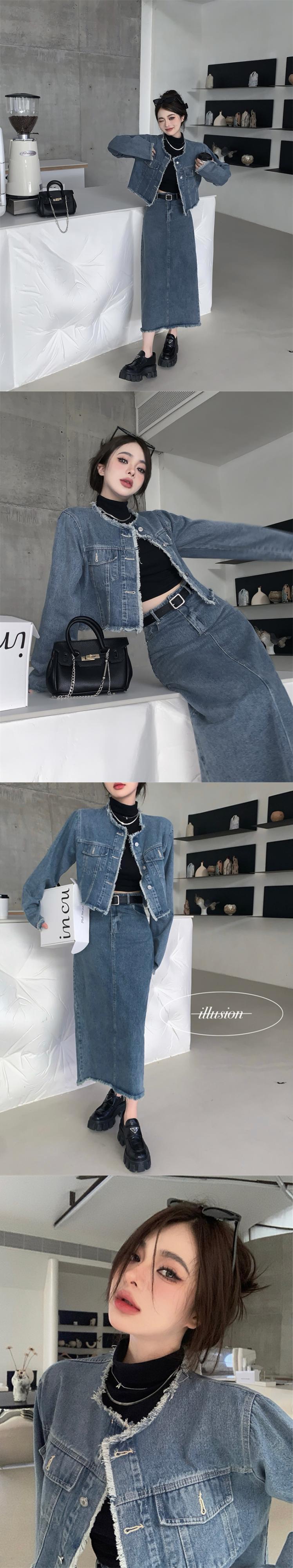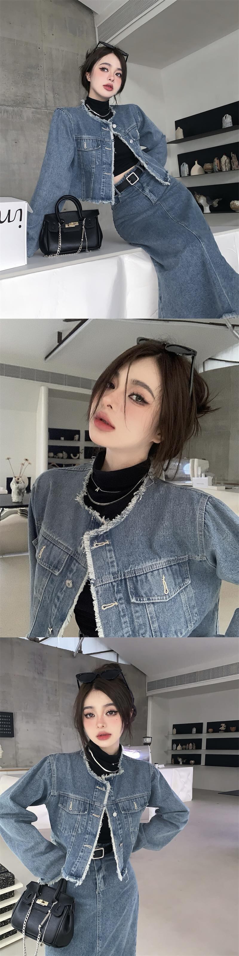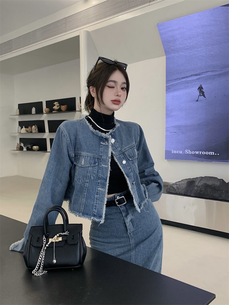 ホットガールスーツ レディース 秋フリース ラウンドネック ショートデニムコート ウエスト 万能ロングスカート 2点セット オータム 秋物 Oネック