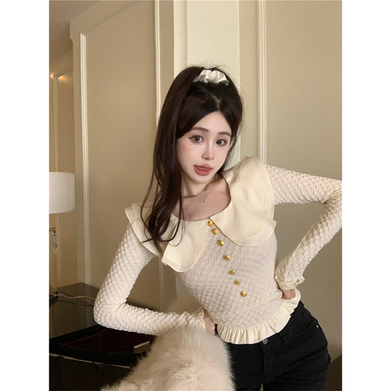 スクエアカラー シフォン シャツ レディース 秋 スリム フィット 多用途 ニット スリム フィット トップ服 オータム 秋物 スクウェア
