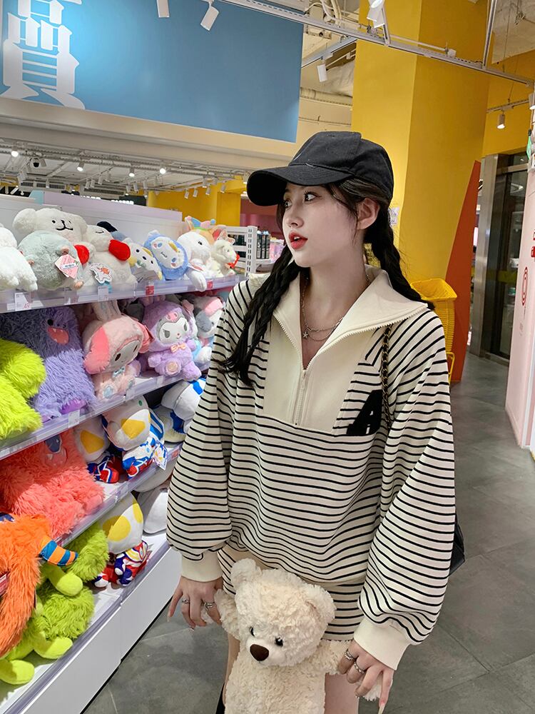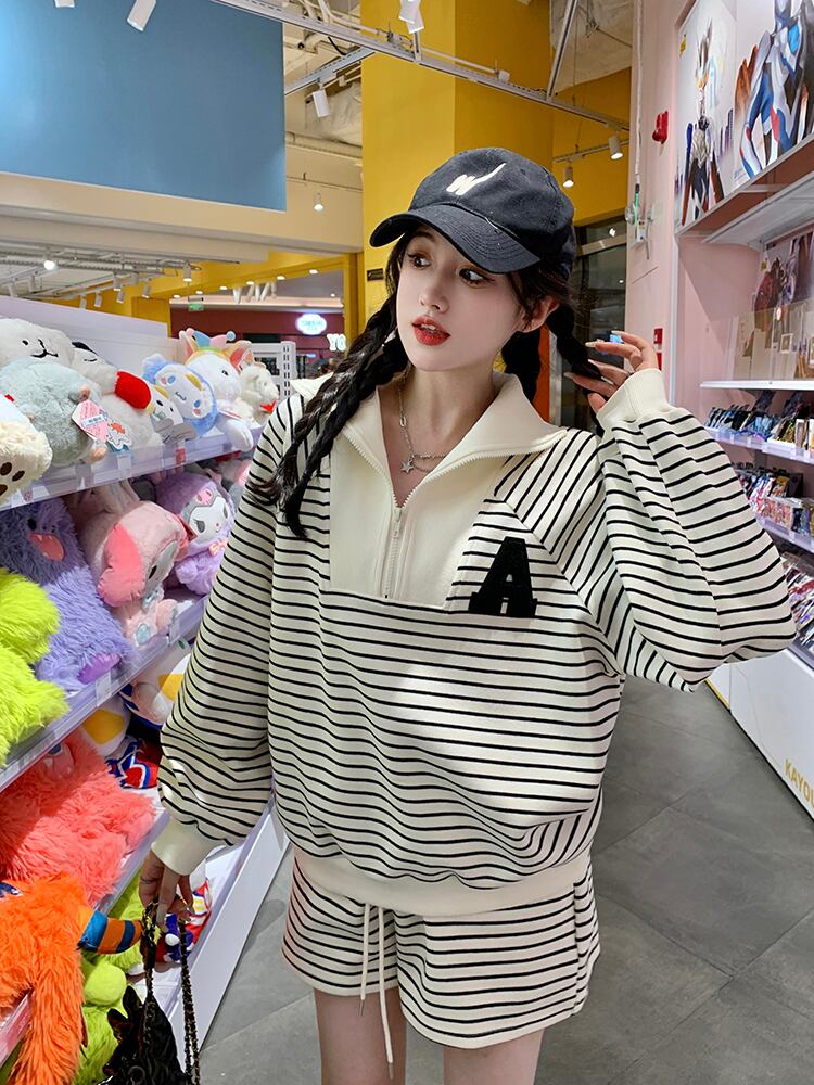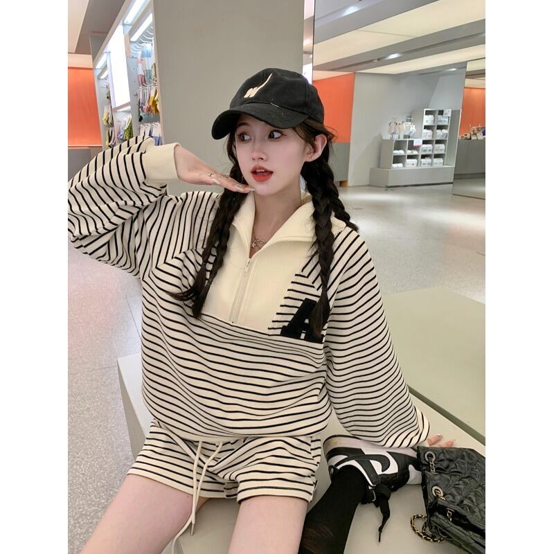 ホットガールストライプスーツ秋ジッパーソリッドレタースウェットシャツウエストショーツツーピースセット服 オータム 秋物 ブルマー ソリッドカラー