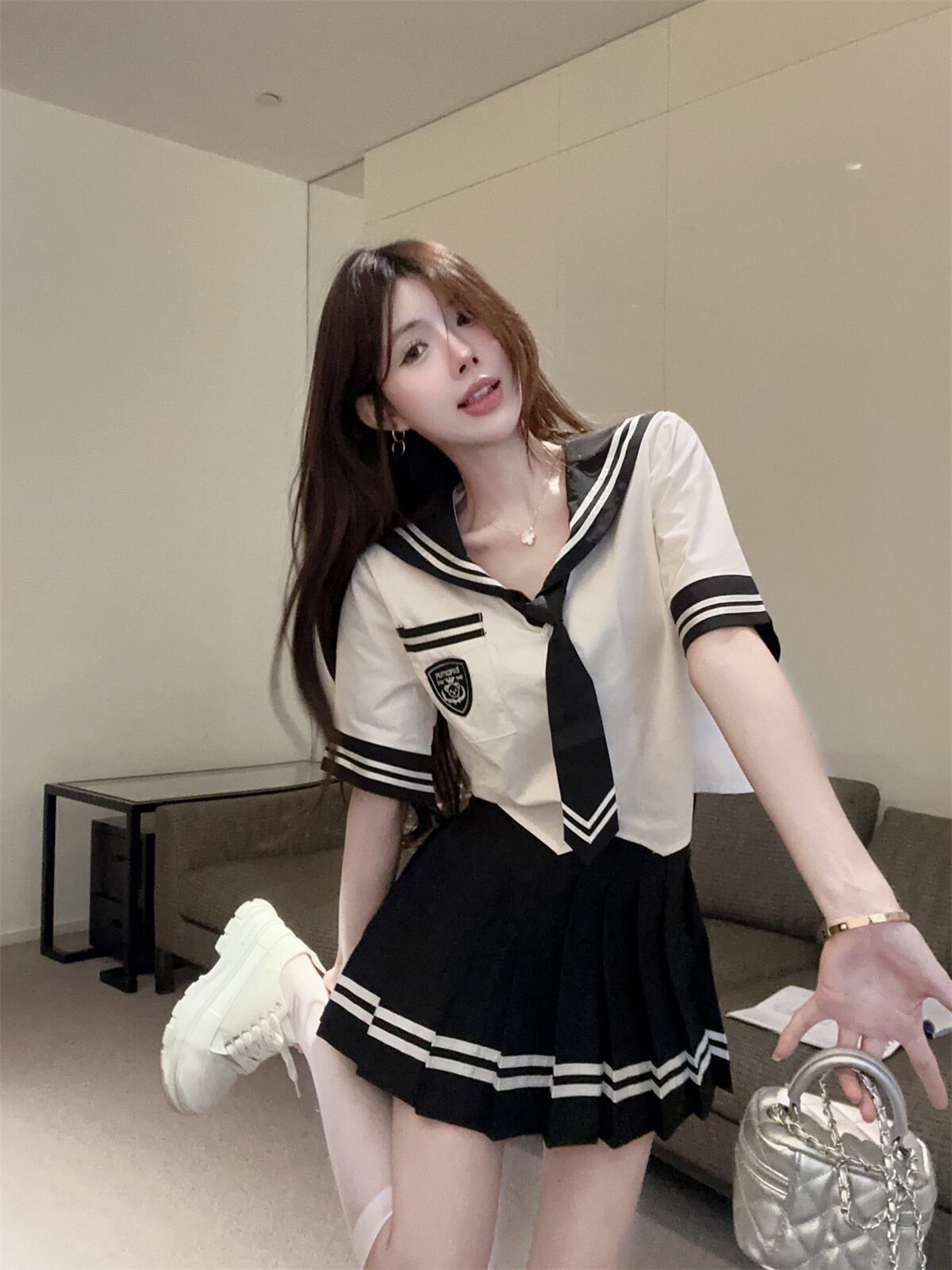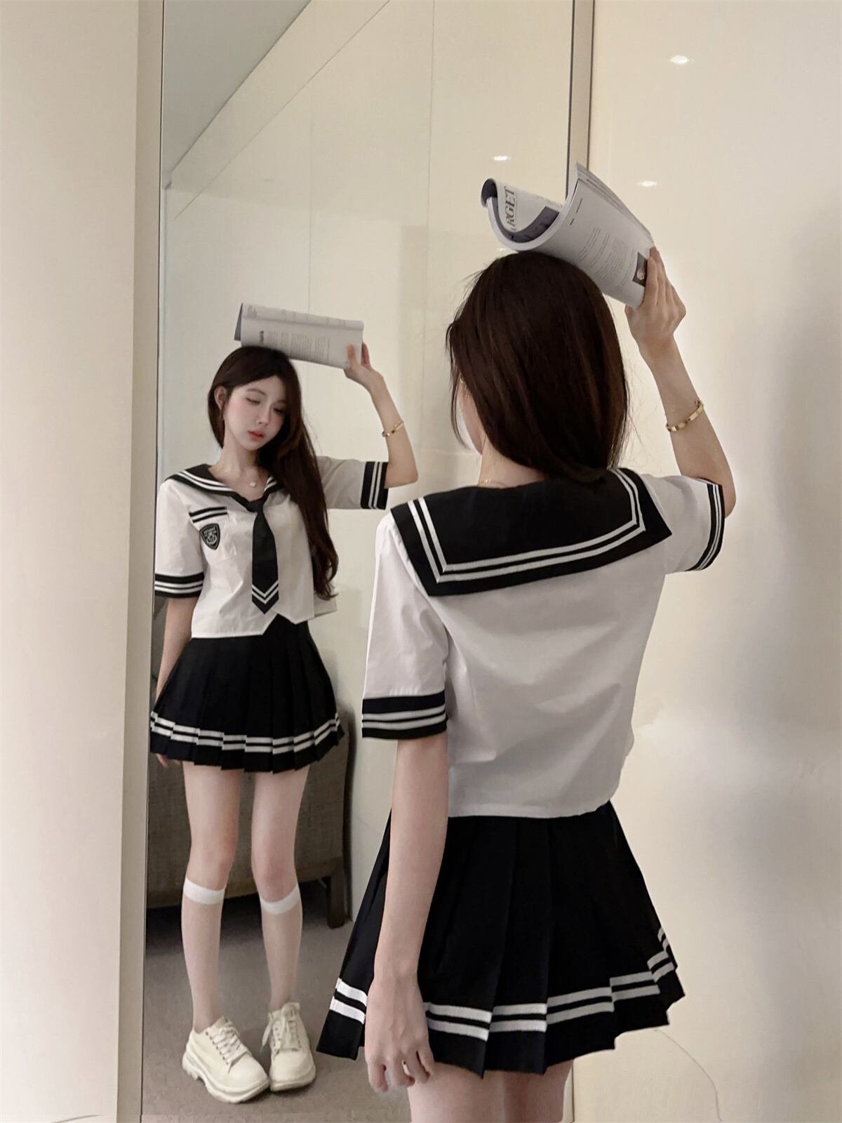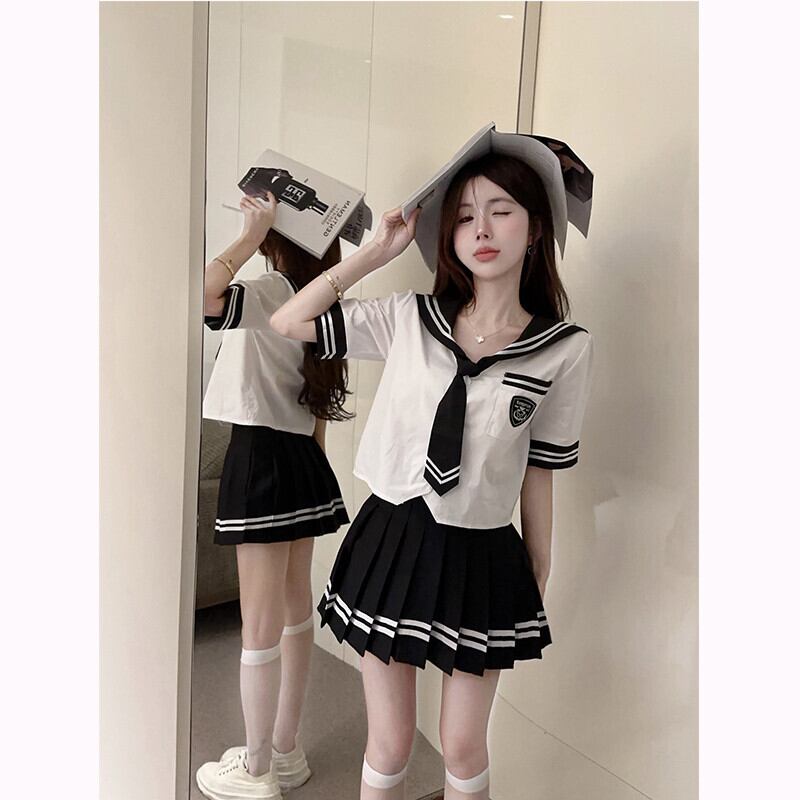 プレッピースタイルスーツ レディース 夏 セーラー襟 ゆったり 半袖 ネクタイ シャツ ウエストプリーツ ショートスカート 2点セット サマー 夏物