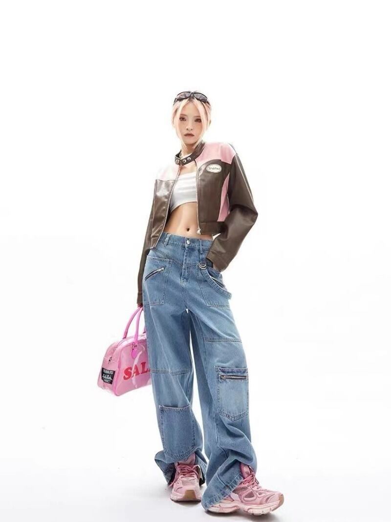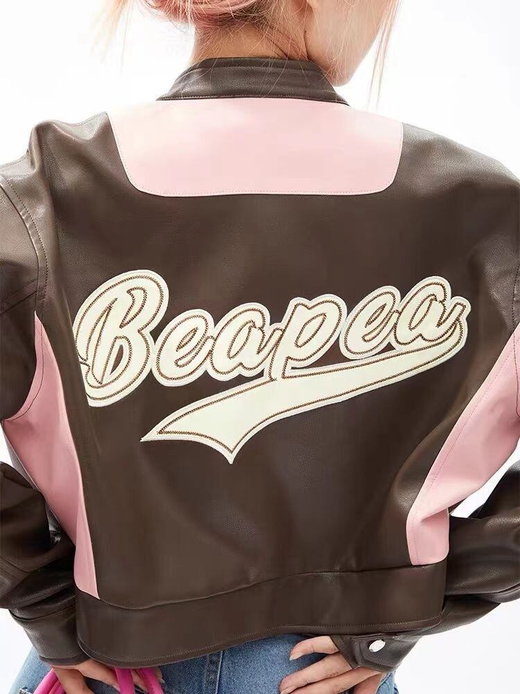 甘くてクールホットガールレトロコントラストカラーモックカラー Pu レザーコート秋パッチ刺繍ショートジッパージャケット 大人ガーリー スウィート キュート カジュアル オータム 秋物