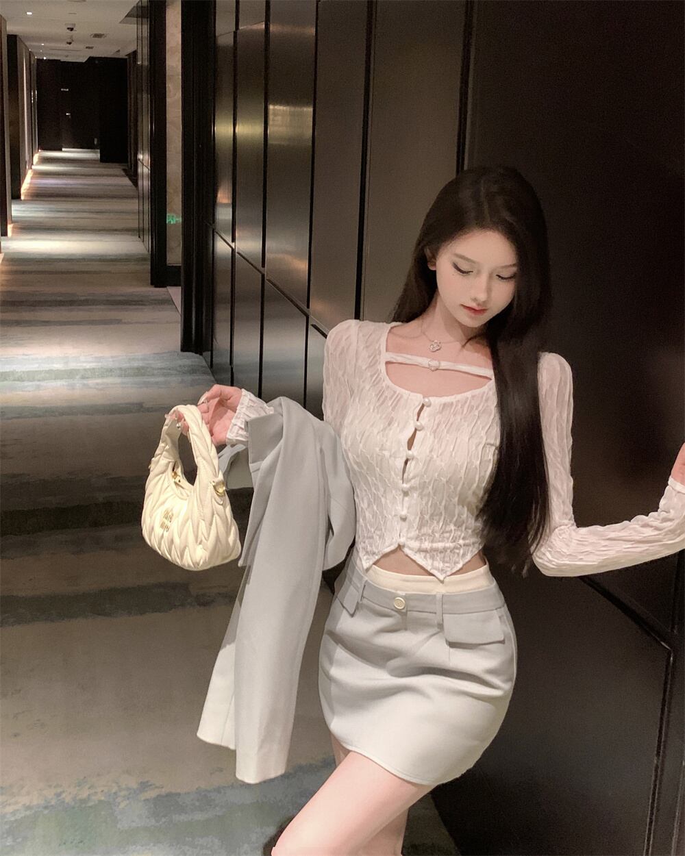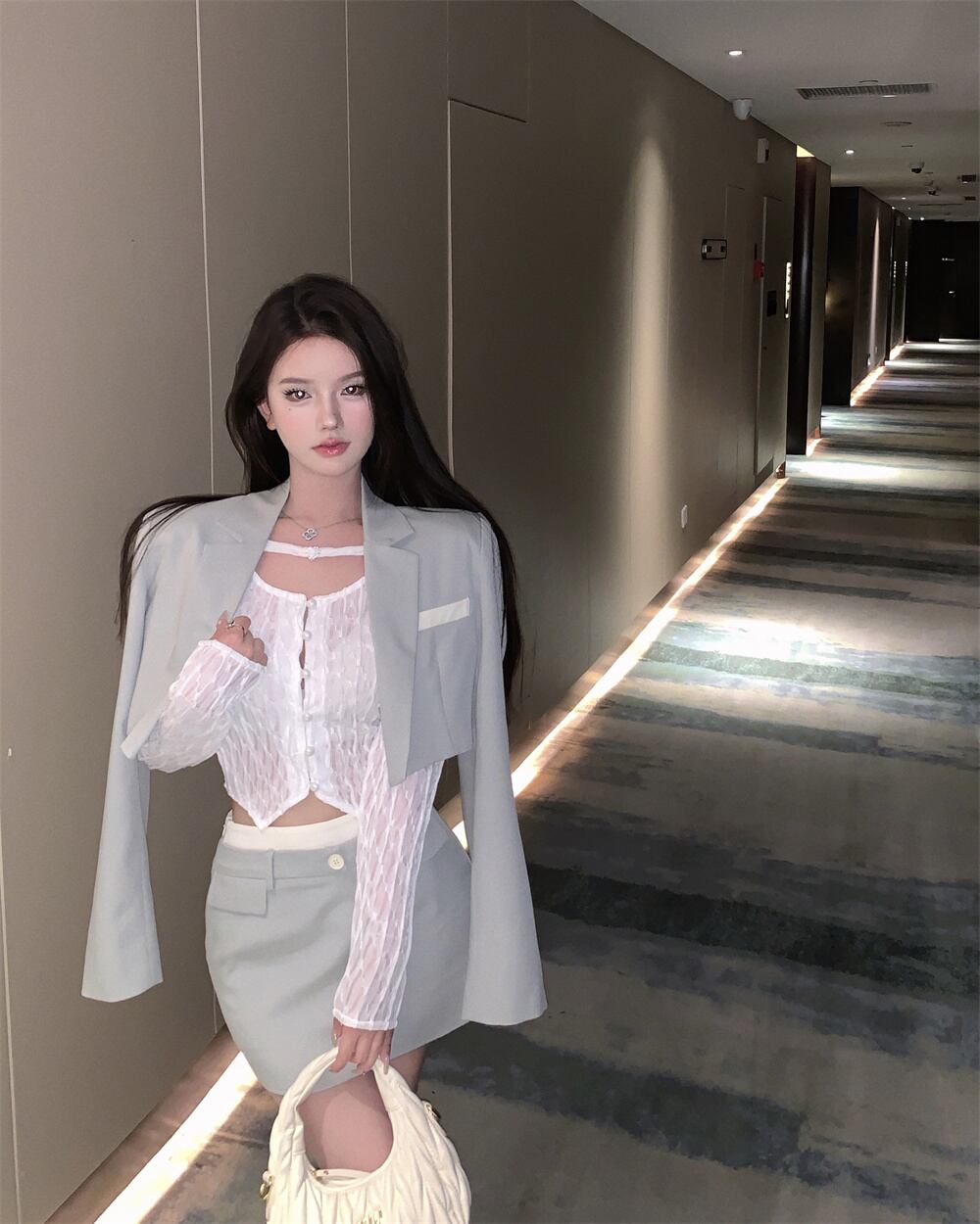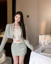 Sweet Hot Girl ミントミルクグリーン スーツ スーツ レディース 秋 長袖 インナー ショート コート ダブルウエスト ミニスカート 3点セット ロング 大人ガーリー スウィート キュート カジュアル オータム 秋物