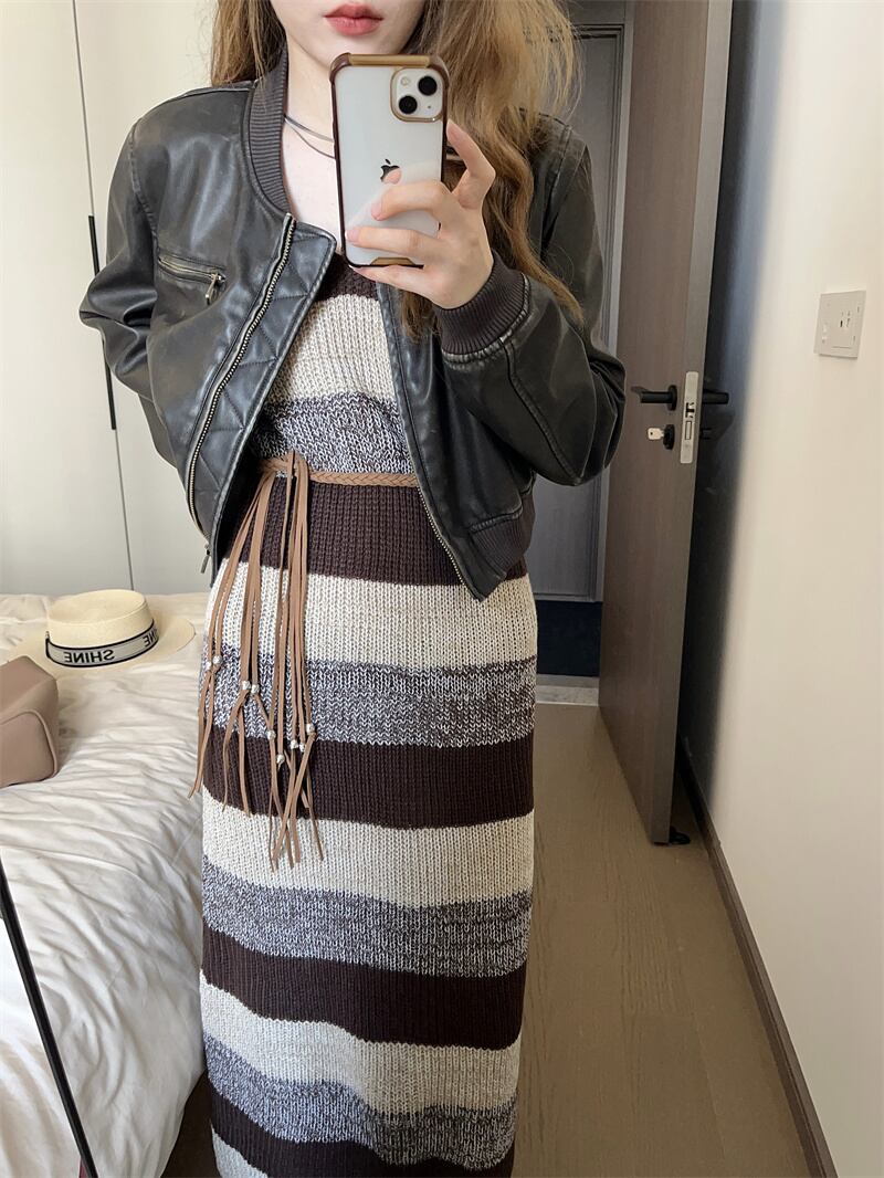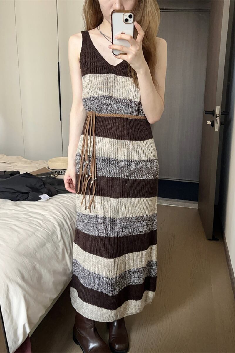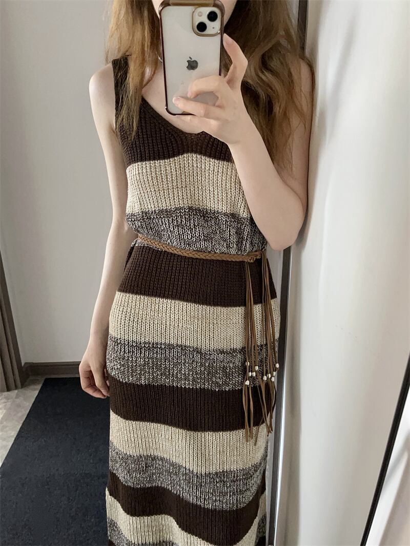 甘いホットガールコントラストストライプニットタンクトップドレス夏ラウンドネックノースリーブロングドレス服 大人ガーリー スウィート キュート カジュアル サマー 夏物 Oネック