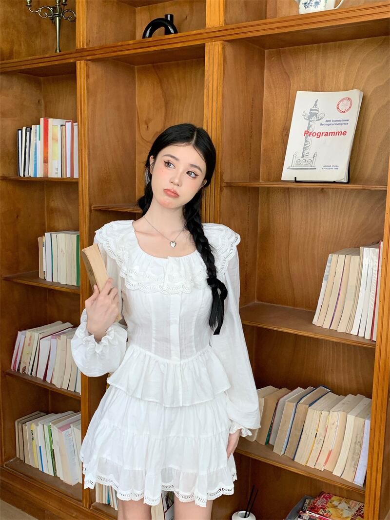 フレンチスイートガールスーツ レディース秋長袖フリルブラウス ウエストAラインショートスカート ツーピースセット服 ロング 大人ガーリー スウィート キュート カジュアル オータム 秋物