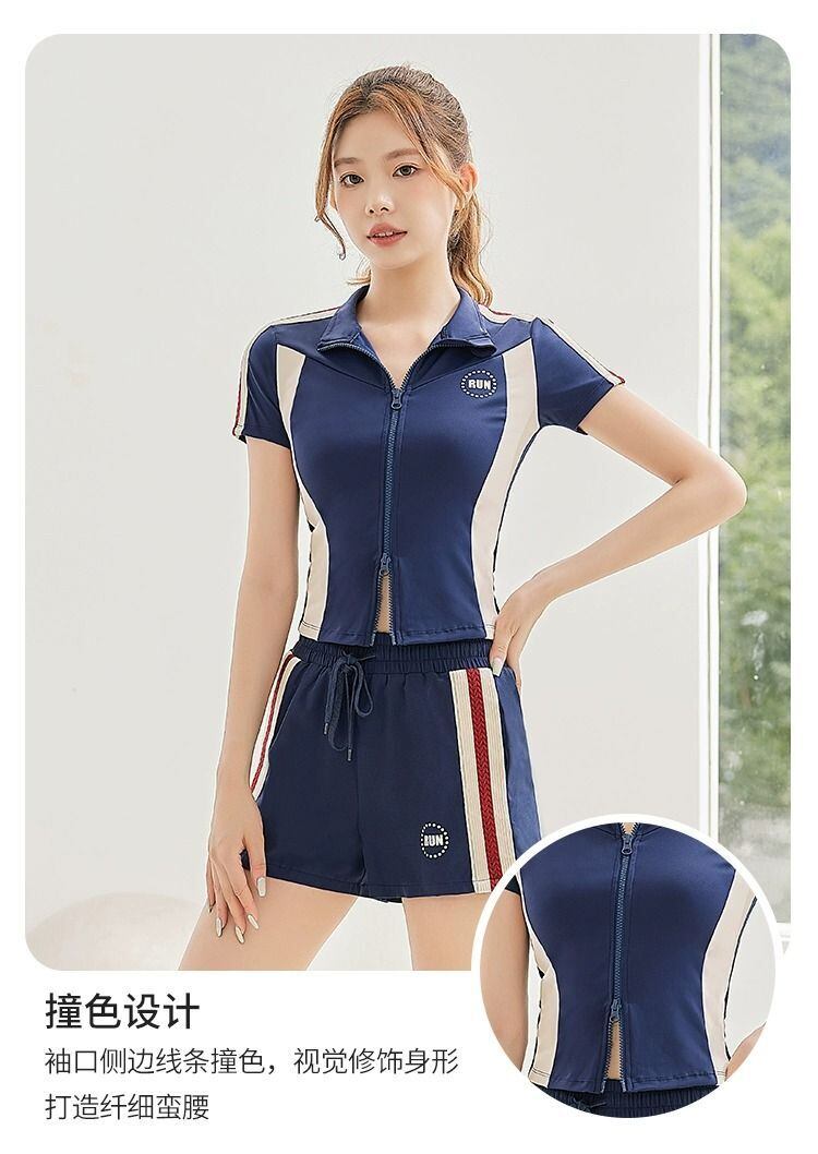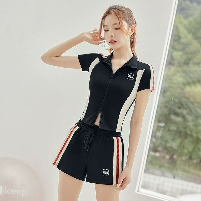 スポーツヨガスーツ夏スタンドカラージッパー半袖コートトップ弾性ウエストショーツ 2 点セット服 エラスティック 伸縮 サマー 夏物 ブルマー