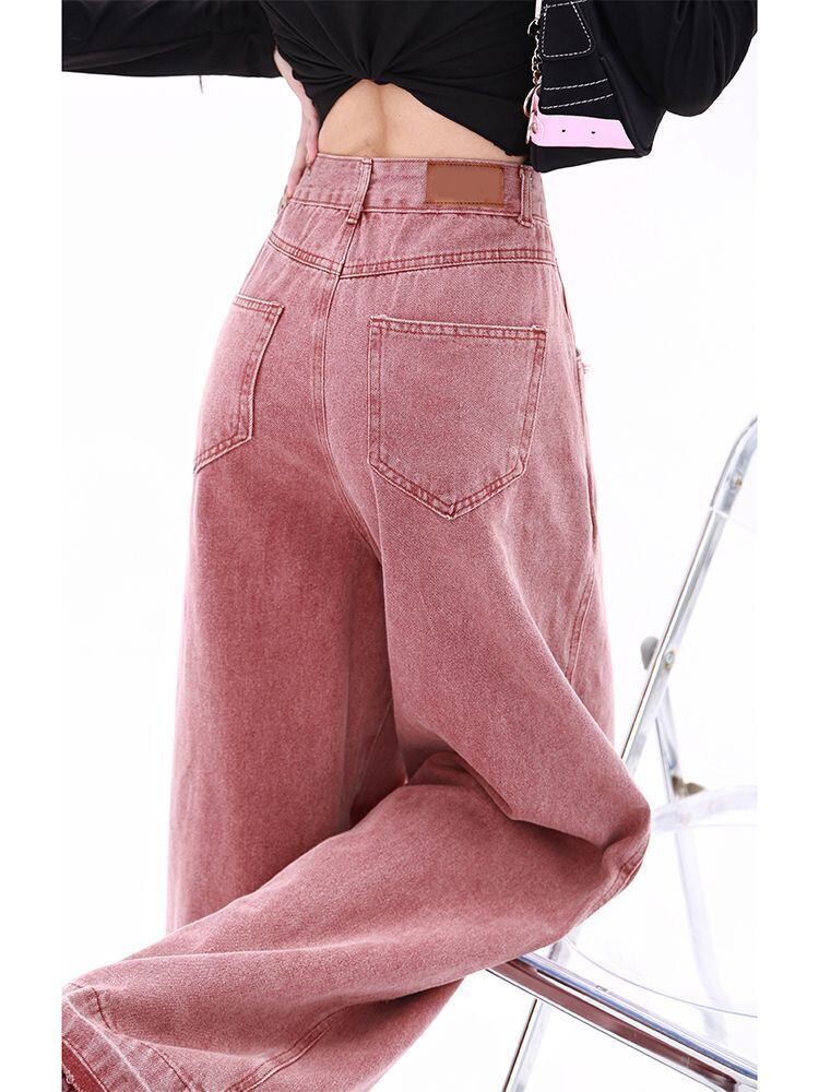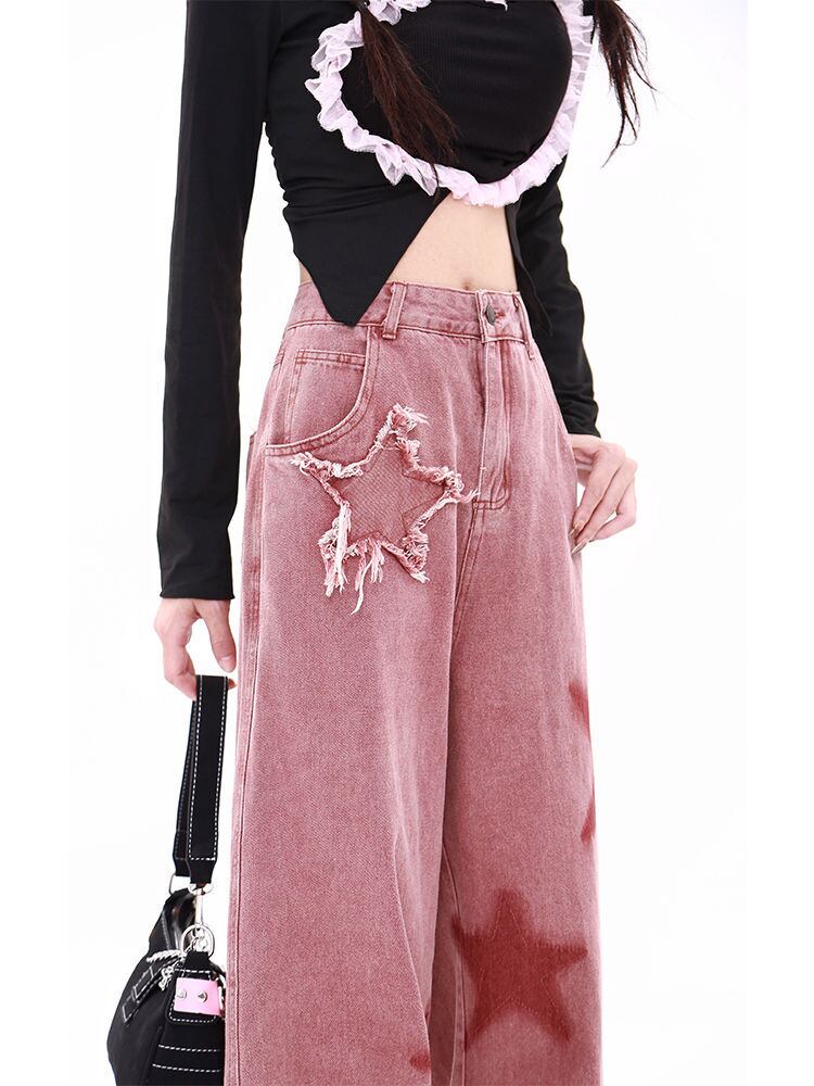 甘いホットガール刺繍ピンクジーンズ秋ルーズスター柄ウエストワイドレッグロングパンツ服 レッド 大人ガーリー スウィート キュート カジュアル オータム 秋物 ワイドパンツ
