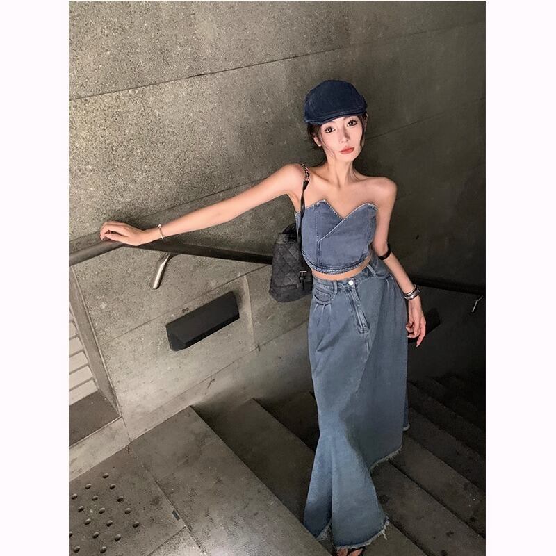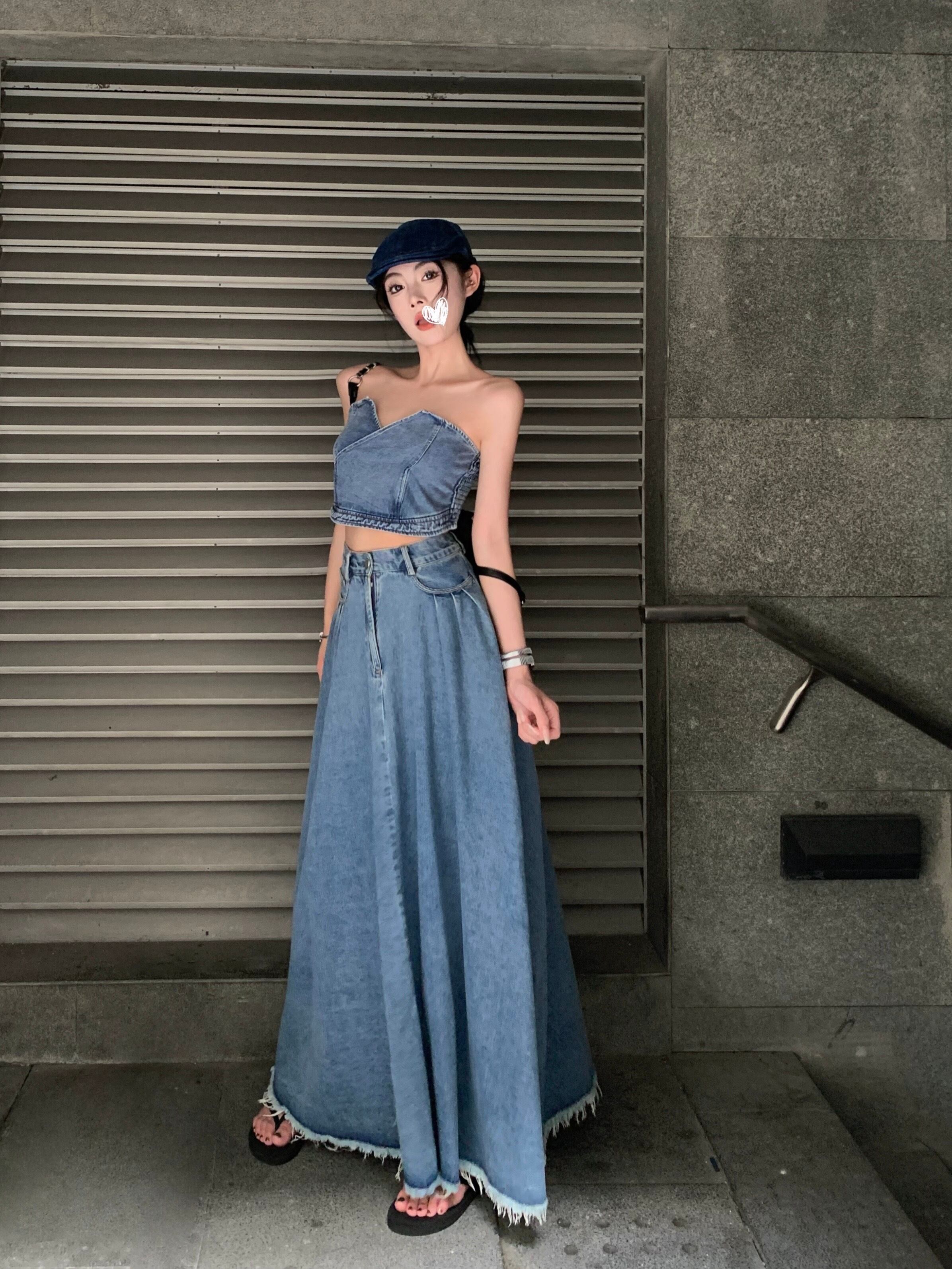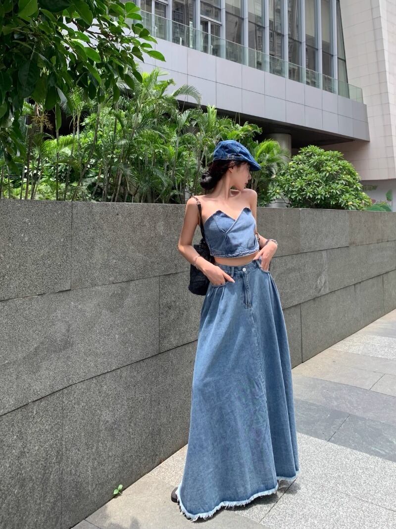 スイートガールスーツ レディース 夏 イレギュラー スリム タンクトップ ウエスト Aライン デニム ロングスカート ツーピースセット 服 大人ガーリー スウィート キュート カジュアル サマー 夏物