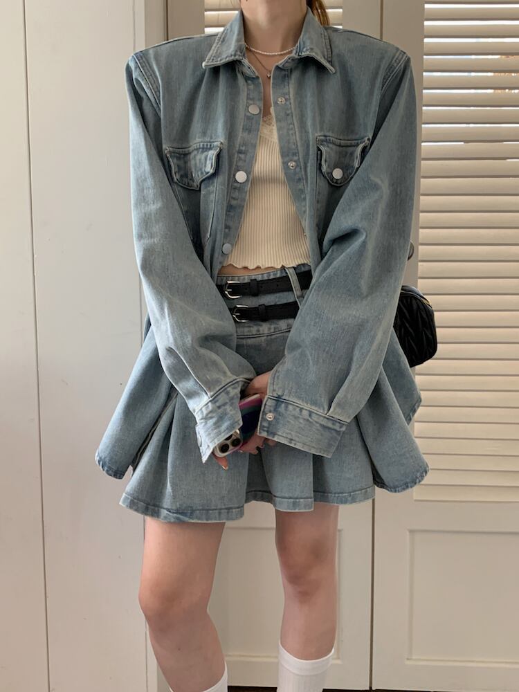 甘いホットガールスーツ秋長袖ウォッシュデニムスカート肩パッドデニムジャケット 2 点セット服 ロング 大人ガーリー スウィート キュート カジュアル オータム 秋物