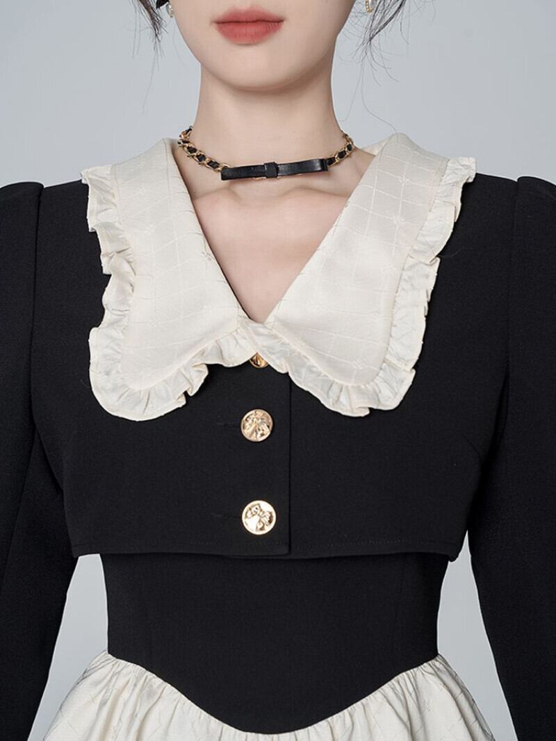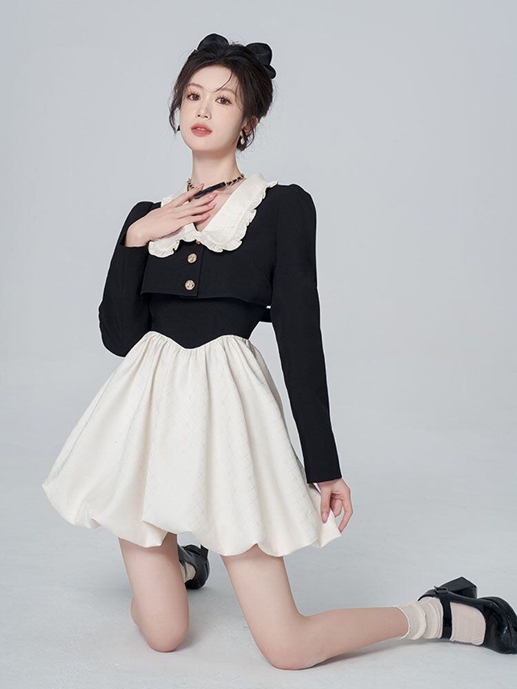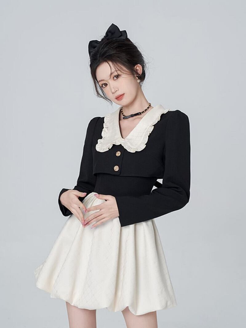 スイートガールスーツ レディース ブラック リボン ターンダウンカラー 長袖 ショートコート ストラップ Aライン ドレス 2点セット 服 ロング 大人ガーリー スウィート キュート カジュアル