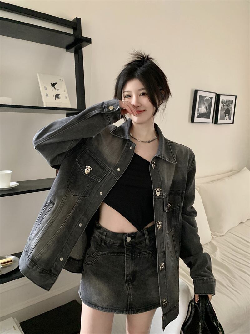 アメリカンレトロスーツ秋黒長袖ジャケットウエストヒップラップミニスカートツーピースセット服 ロング ブラック オータム 秋物