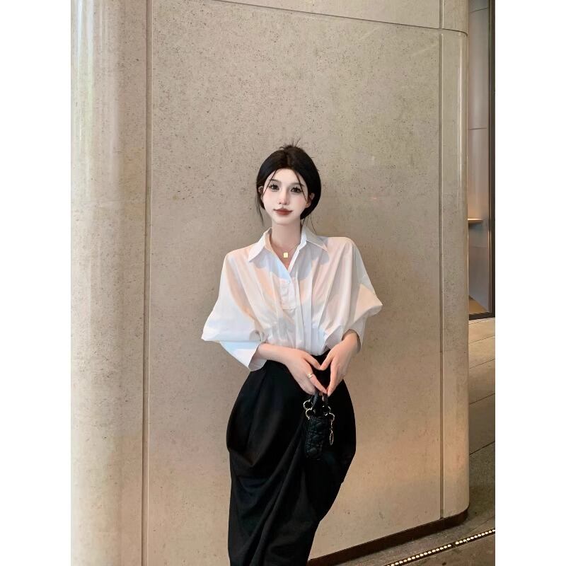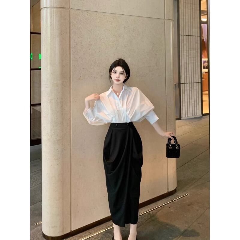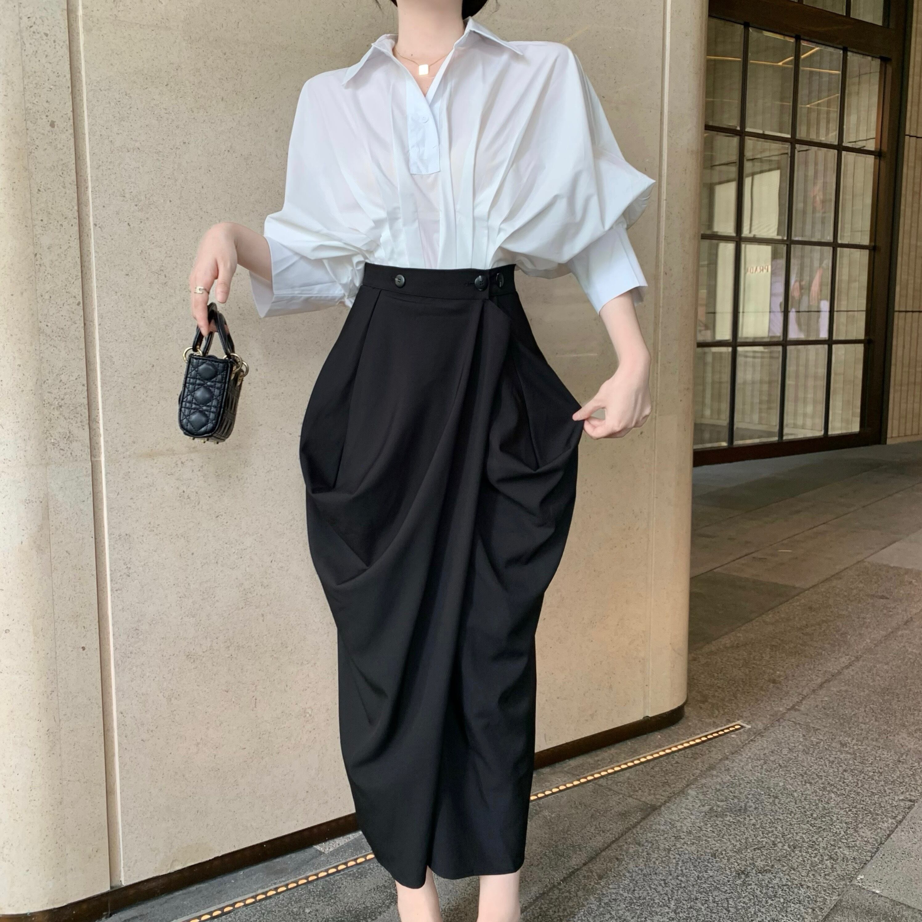 フランスオフィスレディ通勤スーツ夏白シャツウエストロングスカート 2 点セット服 ホワイト サマー 夏物 会社 学校 通勤や通学にも