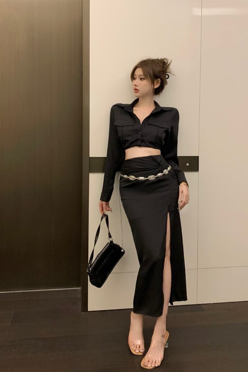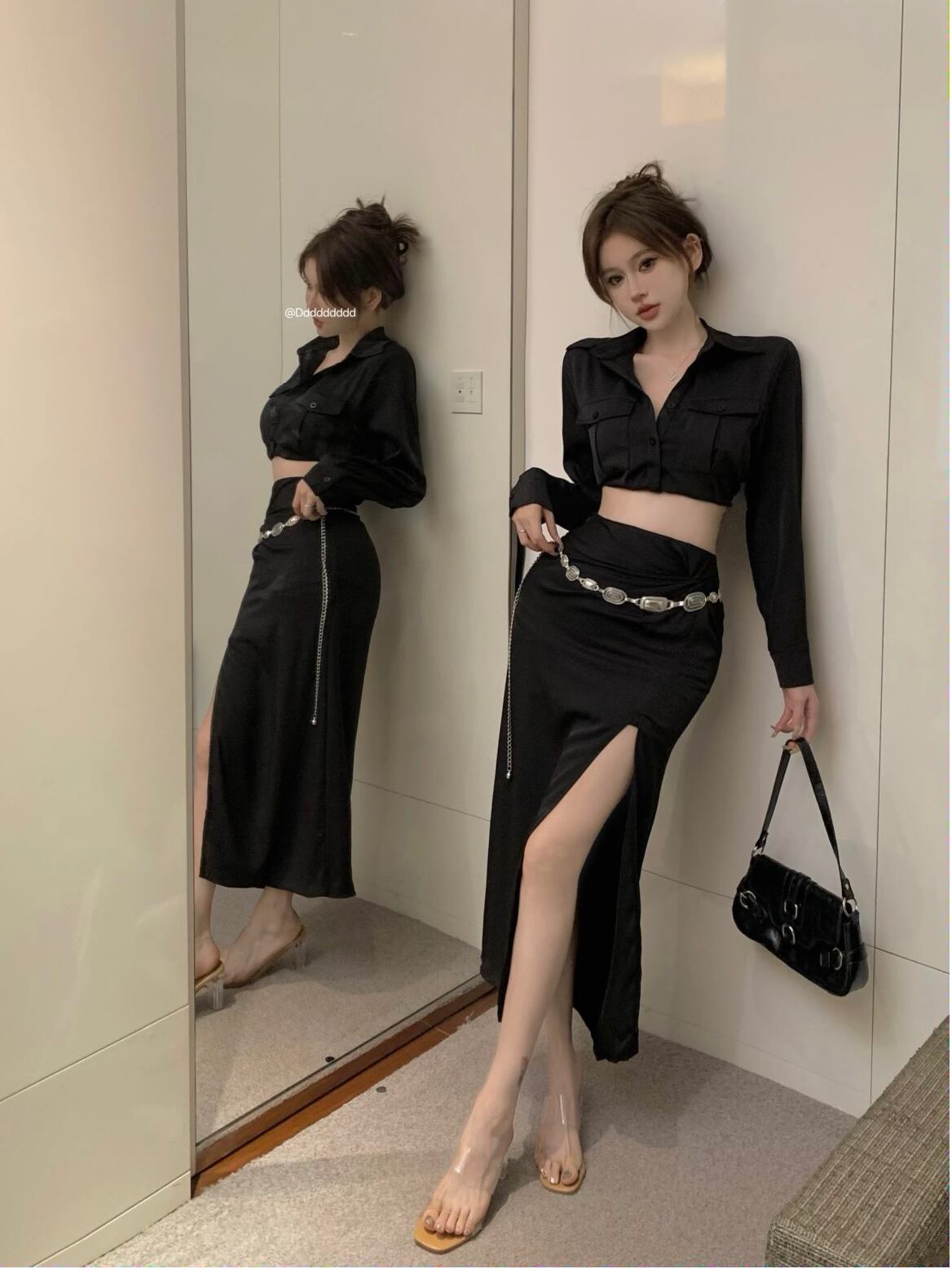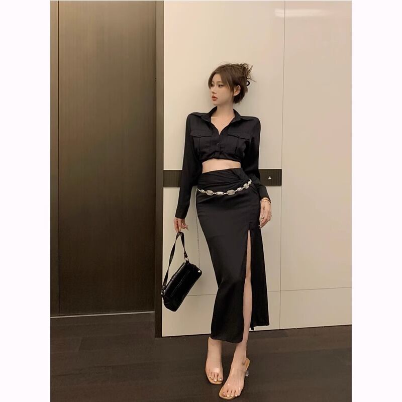 スイートホットガールスーツ秋ターンダウン襟ショートシャツトップツイストスリットロングスカートツーピースセット服 大人ガーリー スウィート キュート カジュアル オータム 秋物