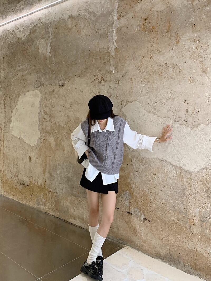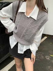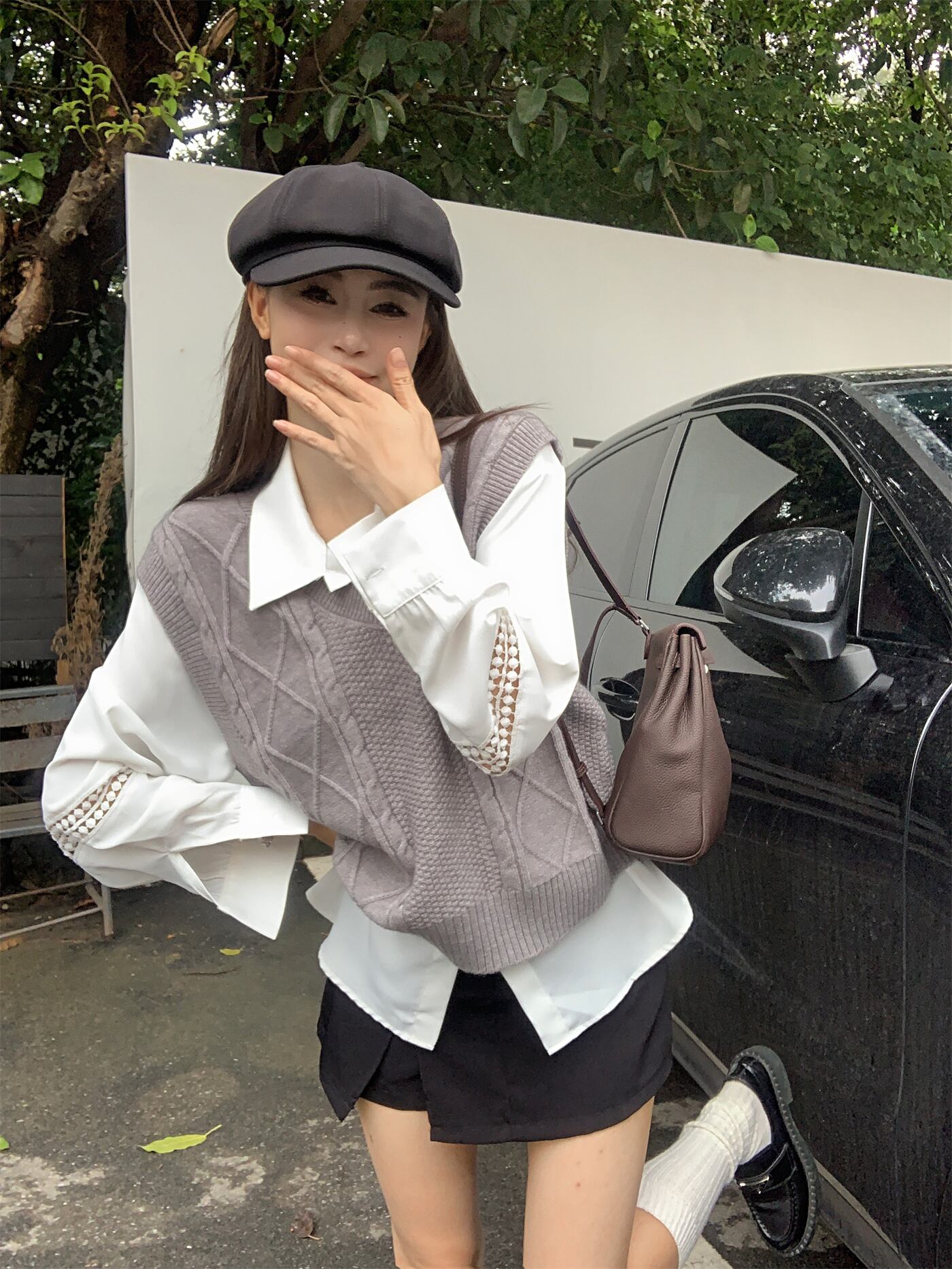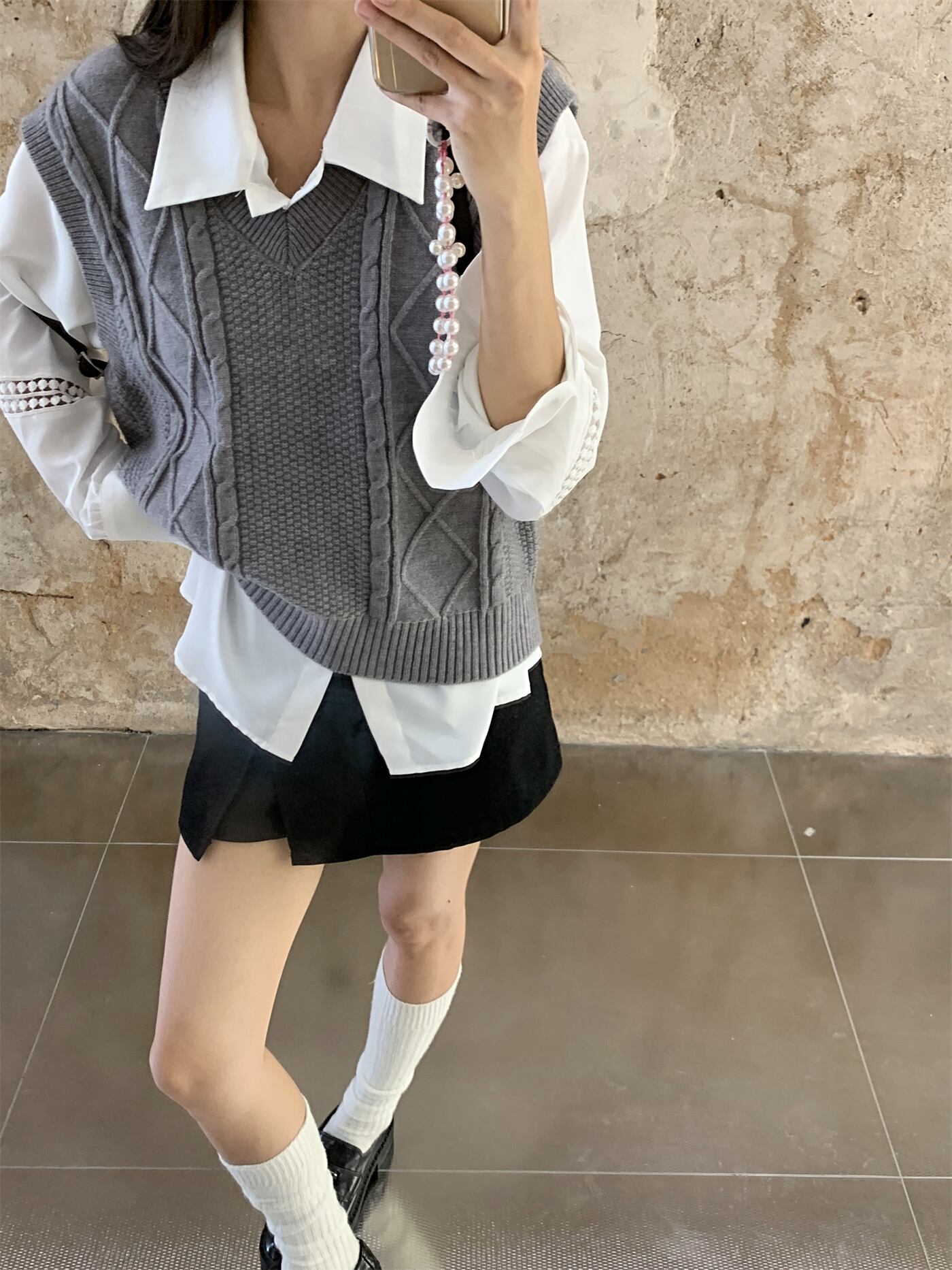 スタイルスーツ秋 V ネックツイストニットベスト中空長袖シャツ 2 点セット服 ロング オータム 秋物 Vネック