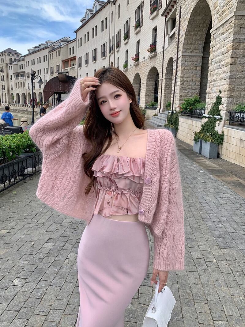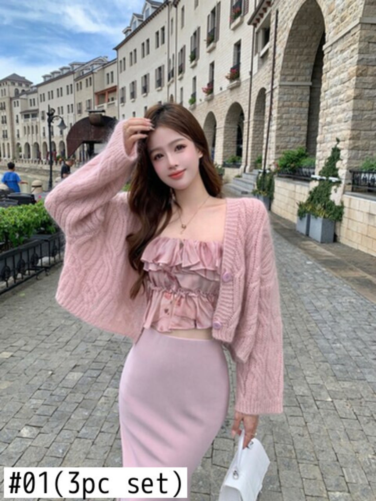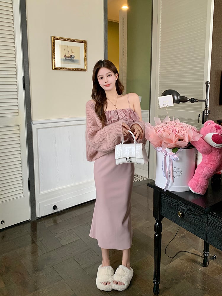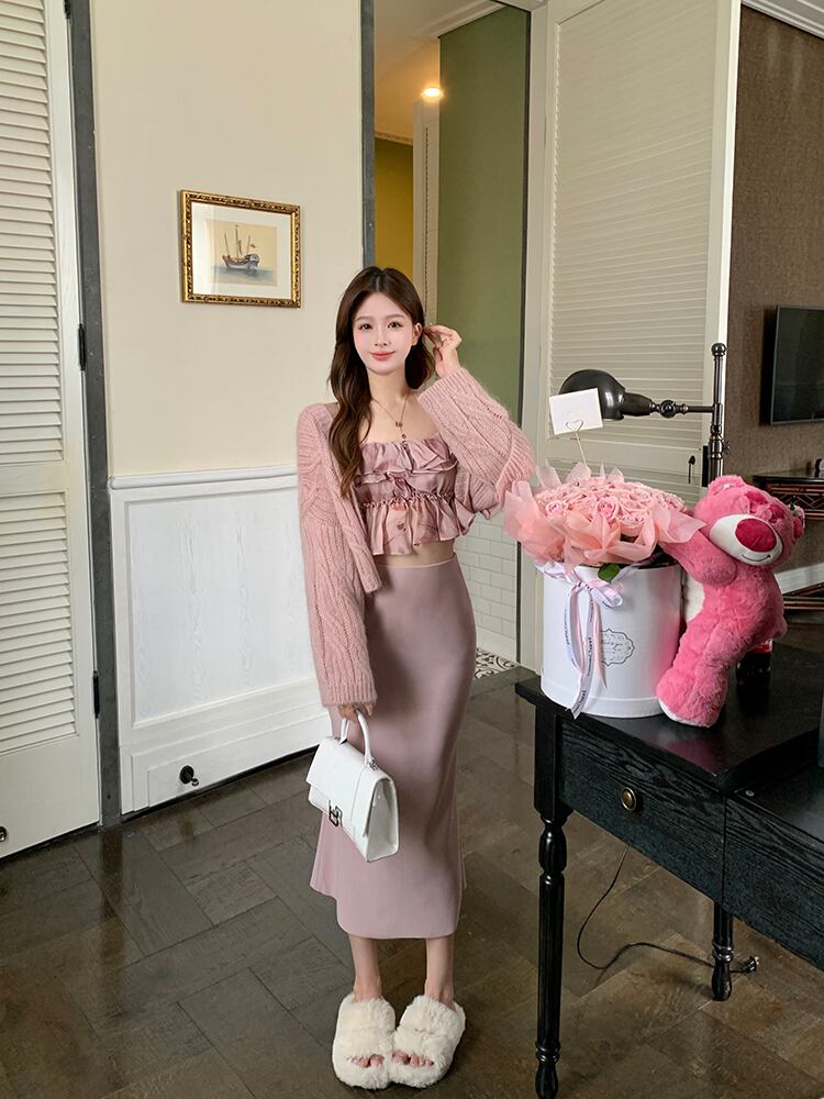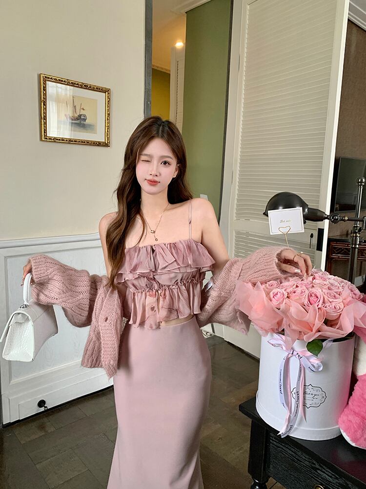 スイートガールスーツ夏長袖ニットコートストラップタンクトップウエストマーメイドスカート 3 点セット服 ロング 大人ガーリー スウィート キュート カジュアル サマー 夏物
