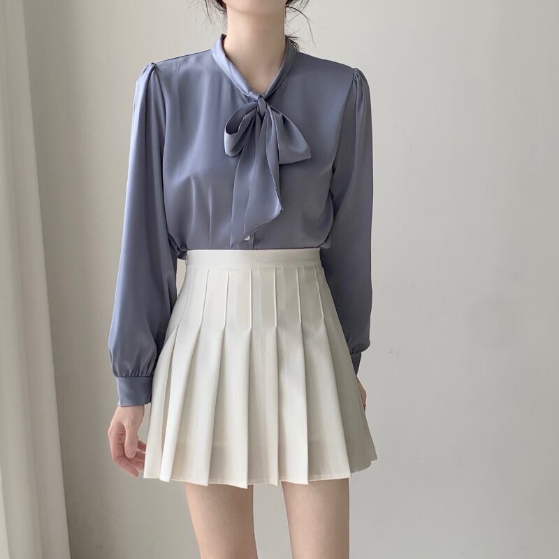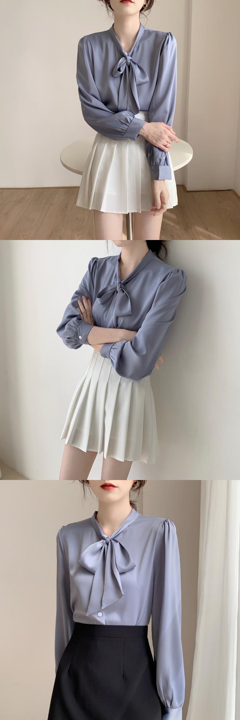 甘いホットガールブルーボウシャツ秋オフィスレディ通勤サテンレースアップシャツトップ服 リボン 大人ガーリー スウィート キュート カジュアル オータム 秋物 会社 学校 通勤や通学にも