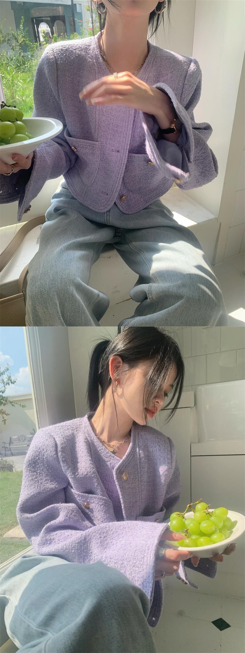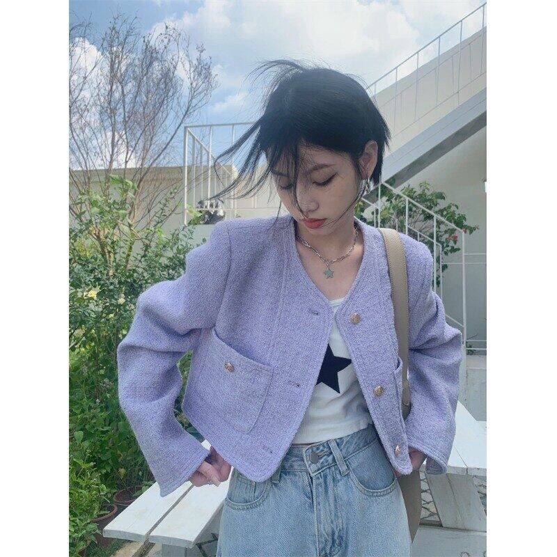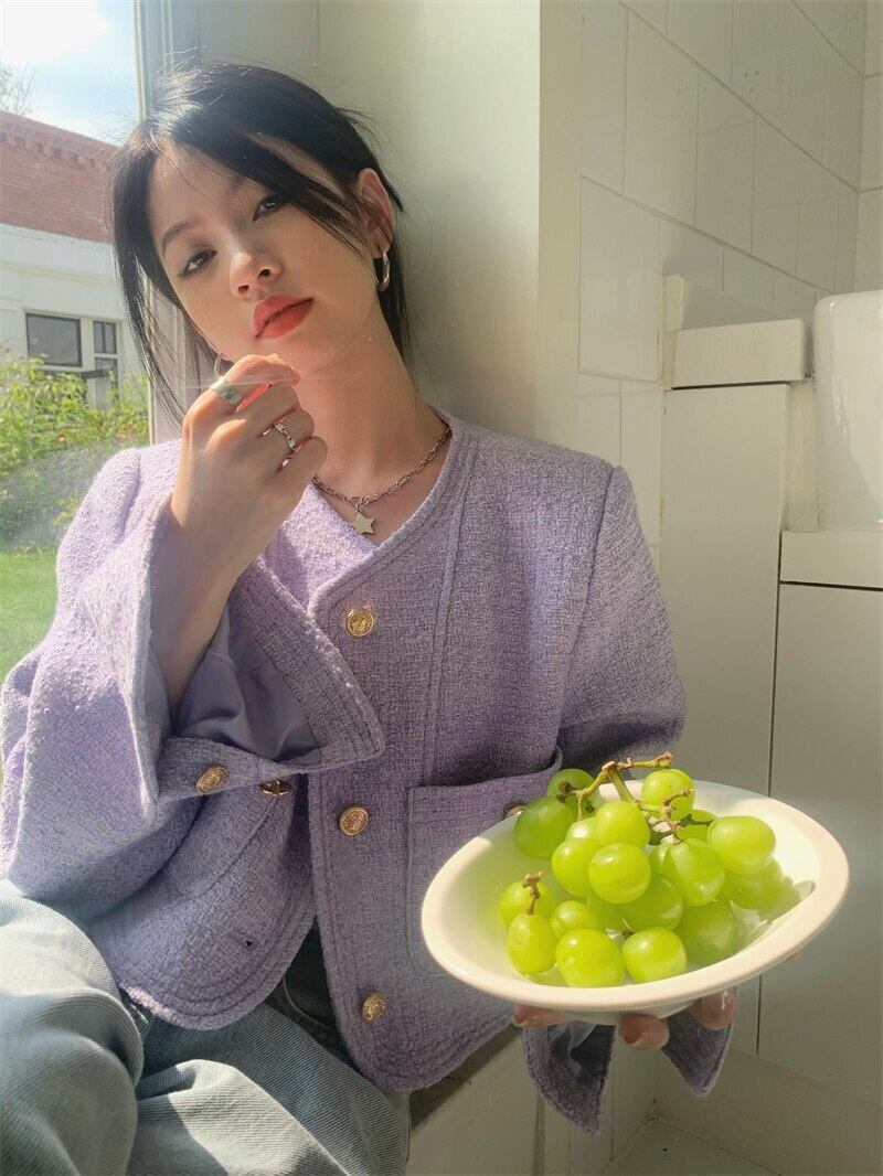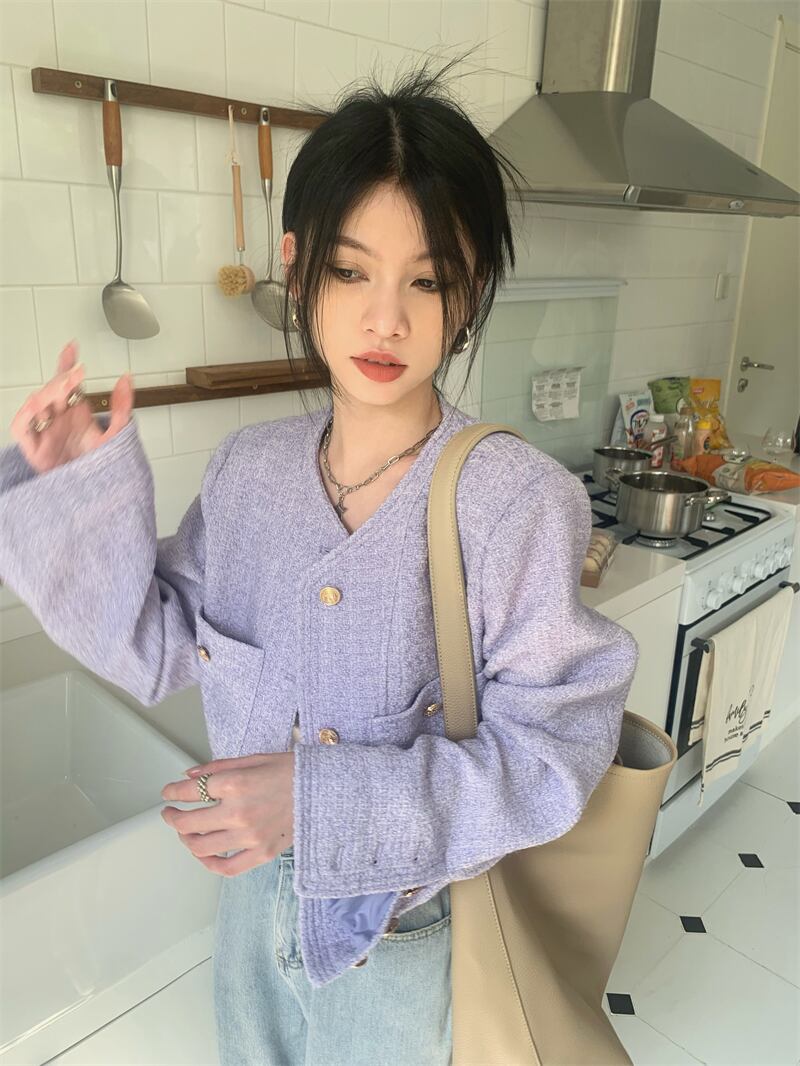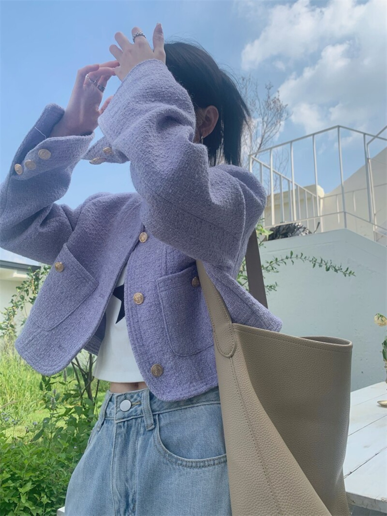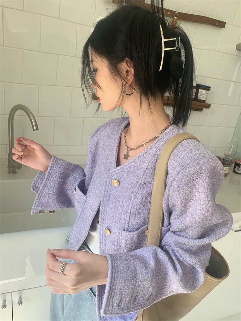 甘いホットガール紫ニットアウターウェア秋絶妙ルーズで多彩ラウンドネック長袖ショートトップ ロング 大人ガーリー スウィート キュート カジュアル オータム 秋物 Oネック パープル