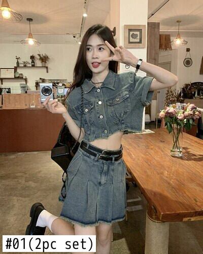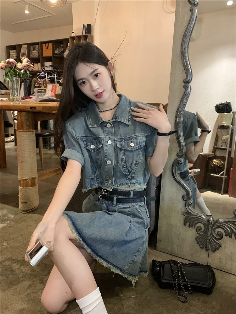 香港風デニムスーツ レディース 夏 ターンダウンカラー 半袖 ジャケット ウエスト Aライン ミニスカート 2点セット サマー 夏物