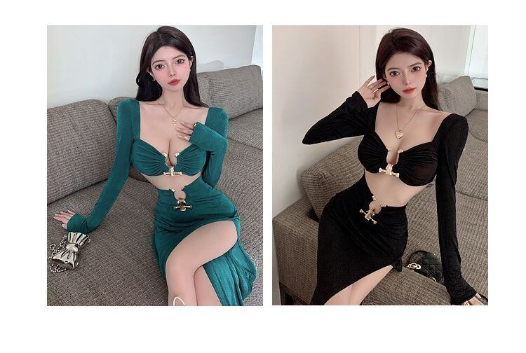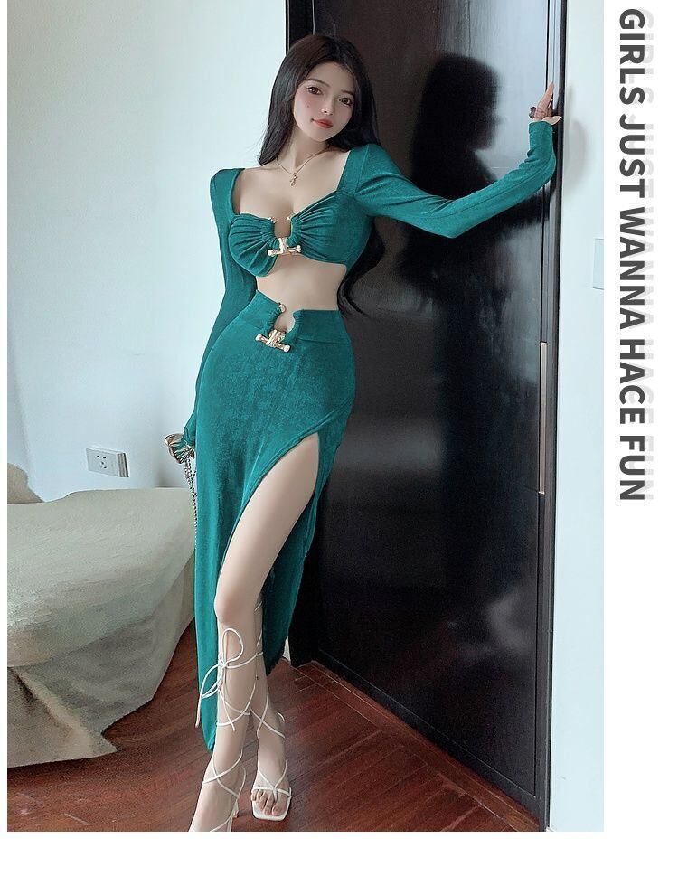 アメリカンセクシースーツ春低胸中空長袖ショートトップウエストスプリットスカートツーピースセット服 ロング スプリング 春物