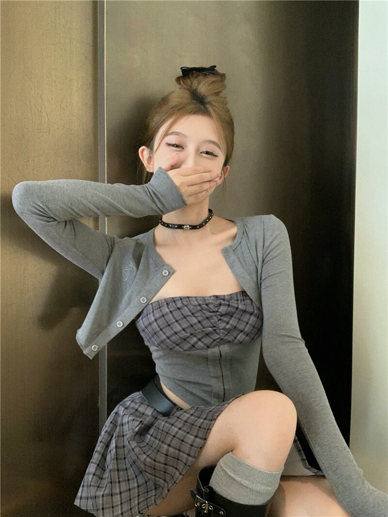 ホットガールズスーツ秋チェック柄スプライスストラップレストップショートコートスリムフィットミニスカート 3 点セット オータム 秋物