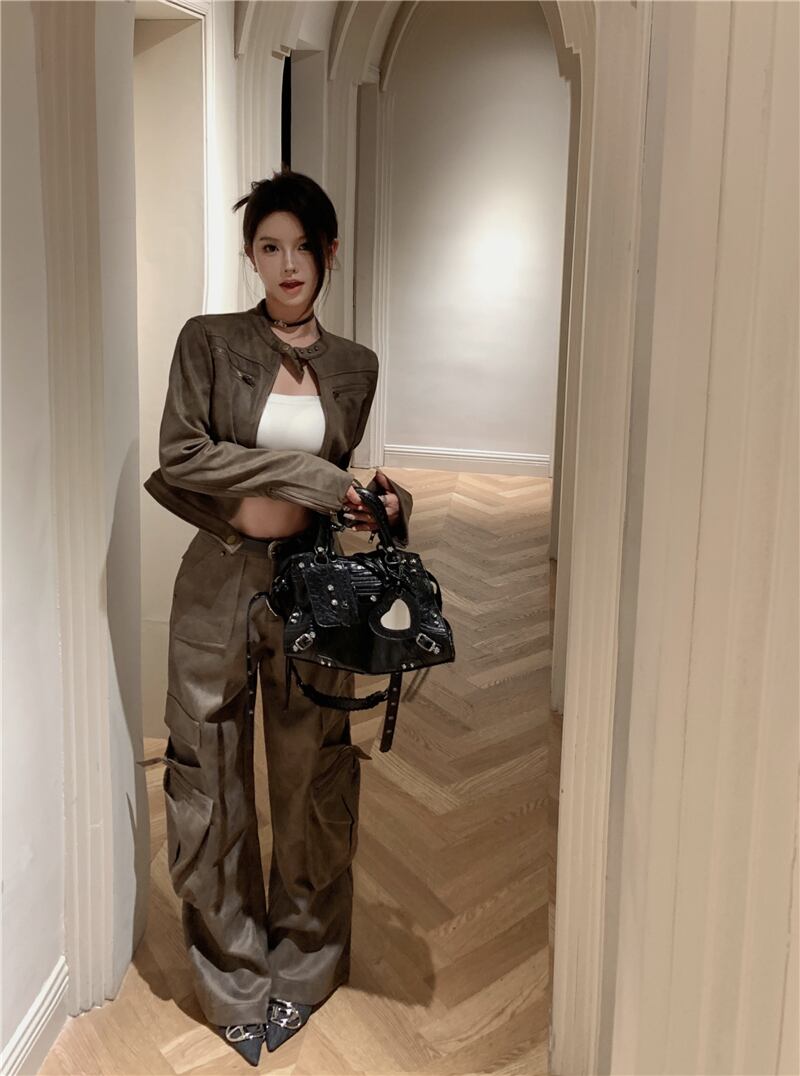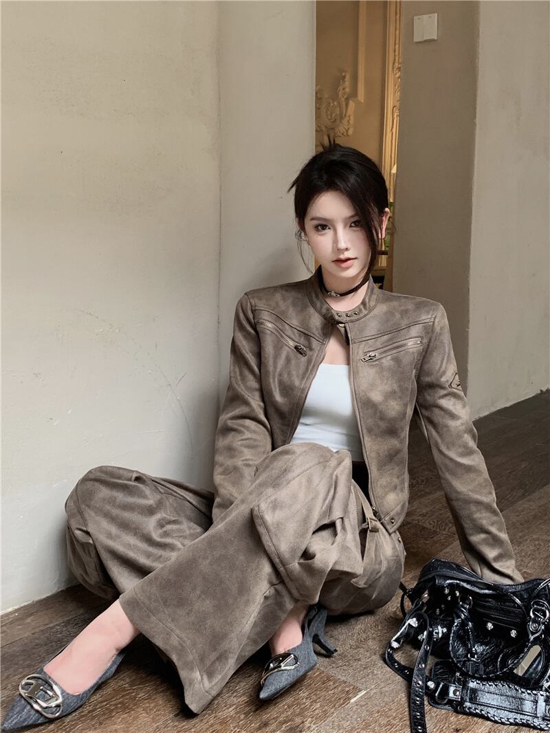 アメリカンレトロスーツ秋長袖PUレザーショートウエストパンツツーピースセット服 ロング オータム 秋物