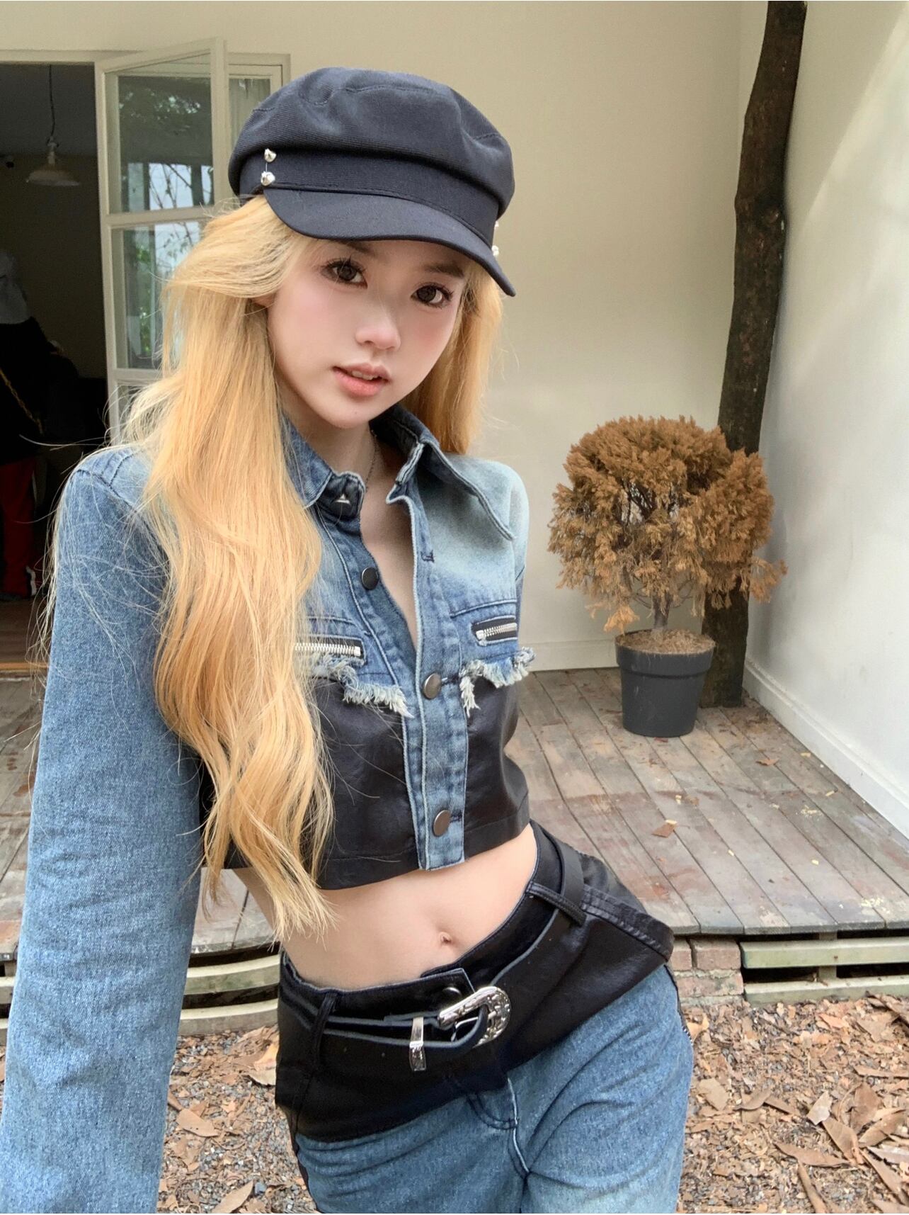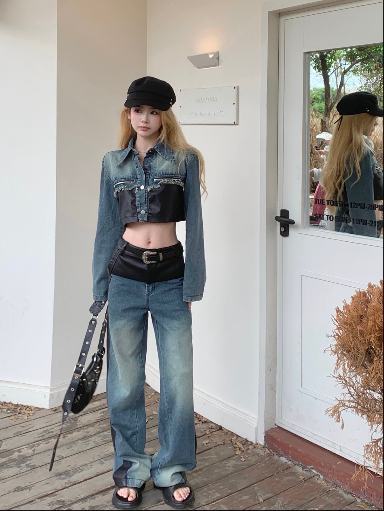 甘いホットガールズスーツ秋スプライスデニムコートトップルーズロングパンツツーピースセット服 大人ガーリー スウィート キュート カジュアル オータム 秋物