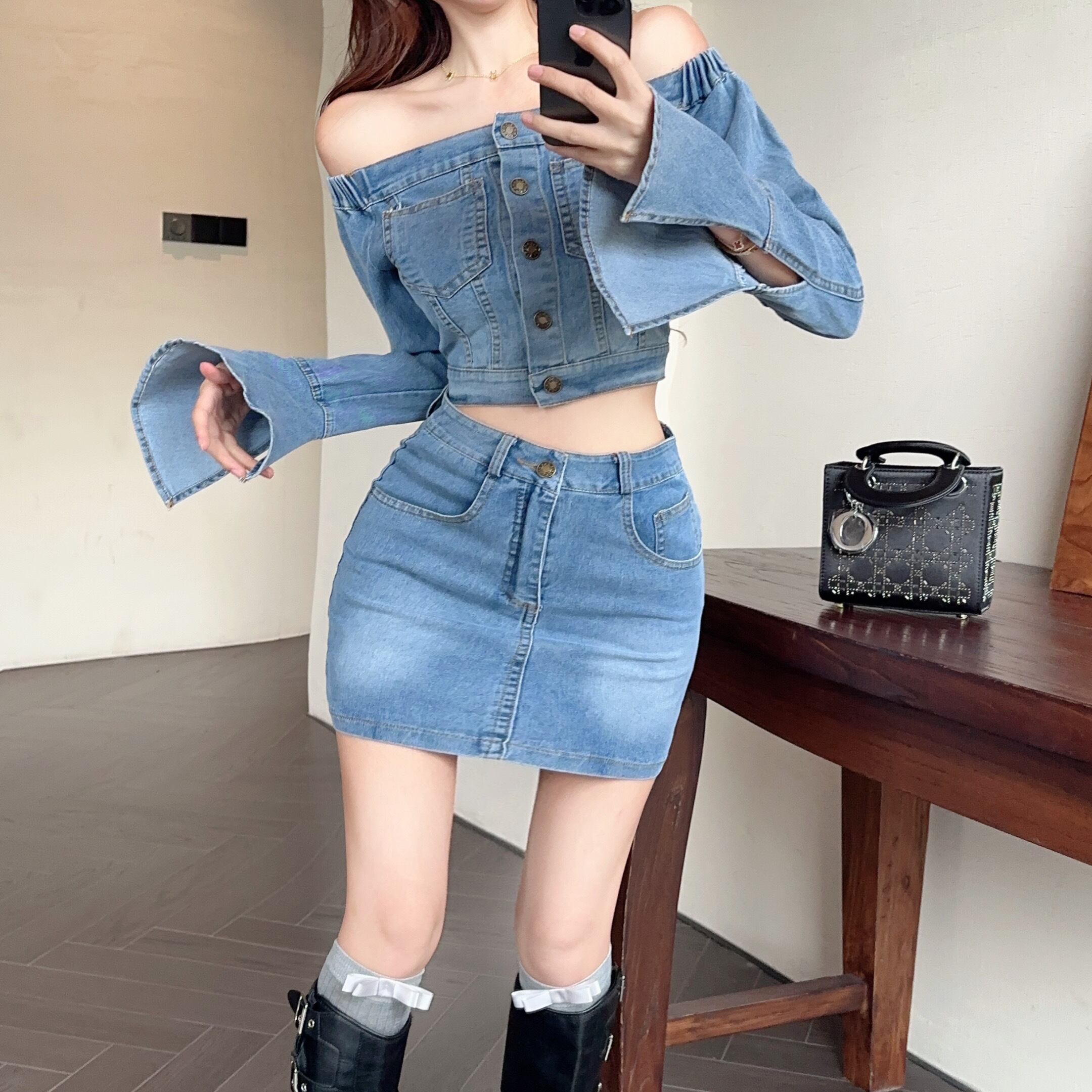 ホットガールズセクシースーツ夏スラッシュネックフレアスリーブオフショルダートップウエストラップヒップデニムスカート 2 点セット サマー 夏物