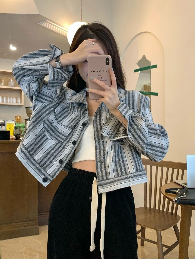 フレンチスタイルストライプコート秋長袖ショートルーズシングルブレストジャケットトップ服 ロング オータム 秋物