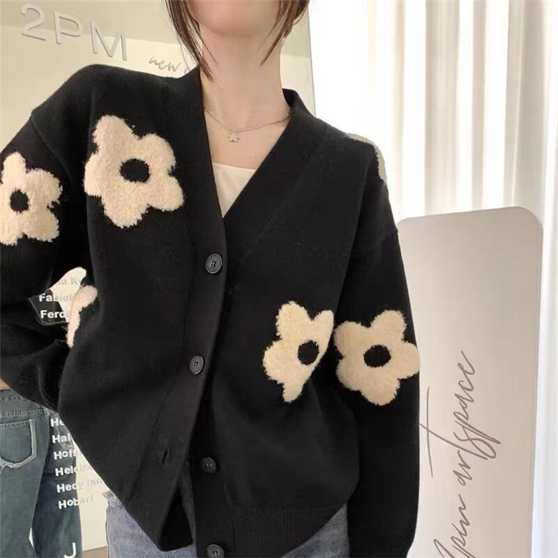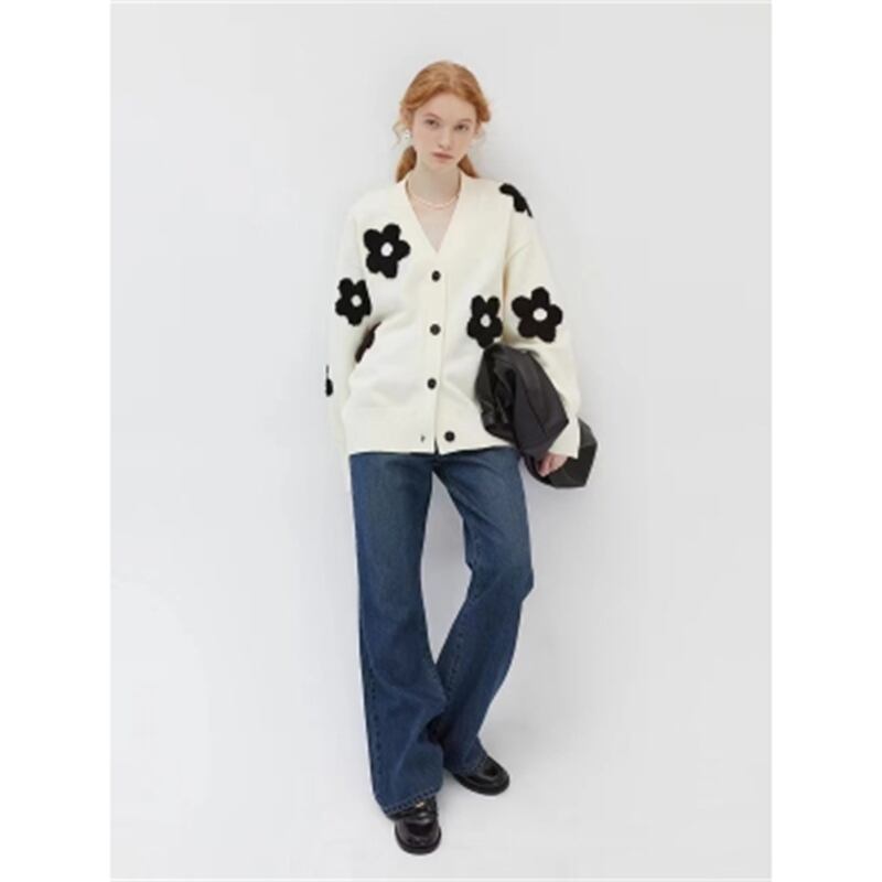 秋冬 V ネック立体セーターカーディガンスリムフラワーニットカーディガンセーターコート オータム 秋物 ウィンター 冬物 Vネック フラワーデザイン