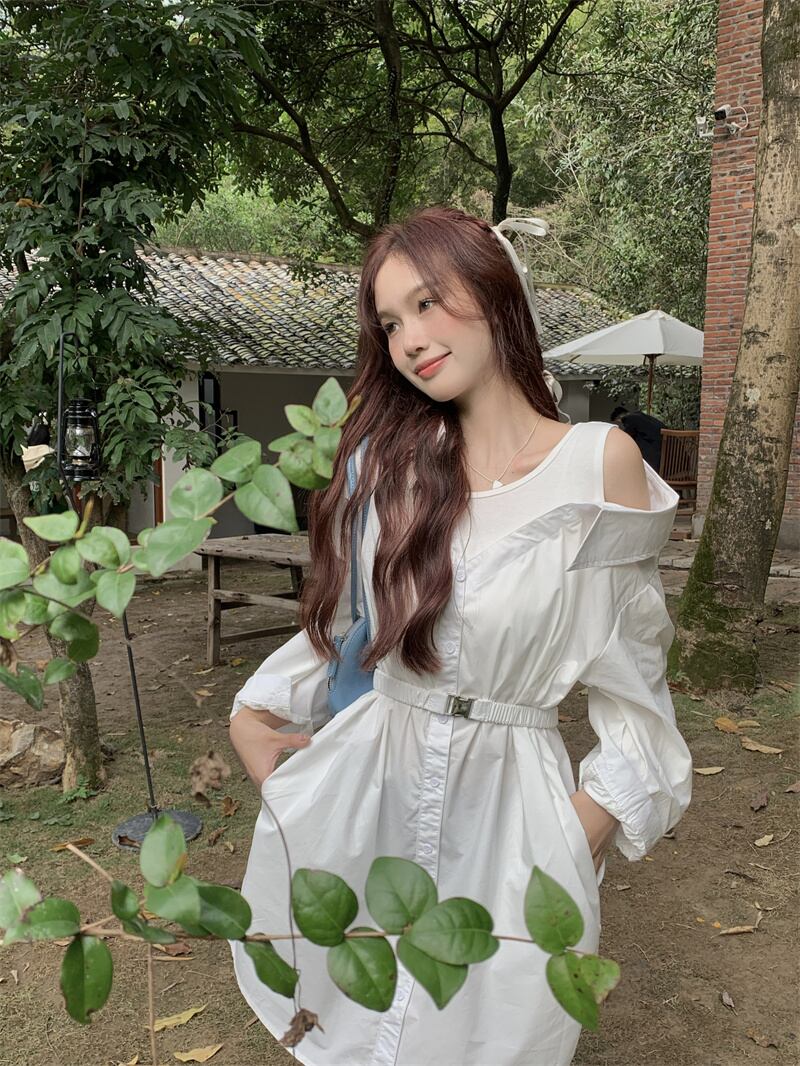 オフィスレディオフショルダー長袖ドレス秋スリムフィットシャツスプライス偽ツーピースドレス服 ロング オータム 秋物 会社 学校 通勤や通学にも