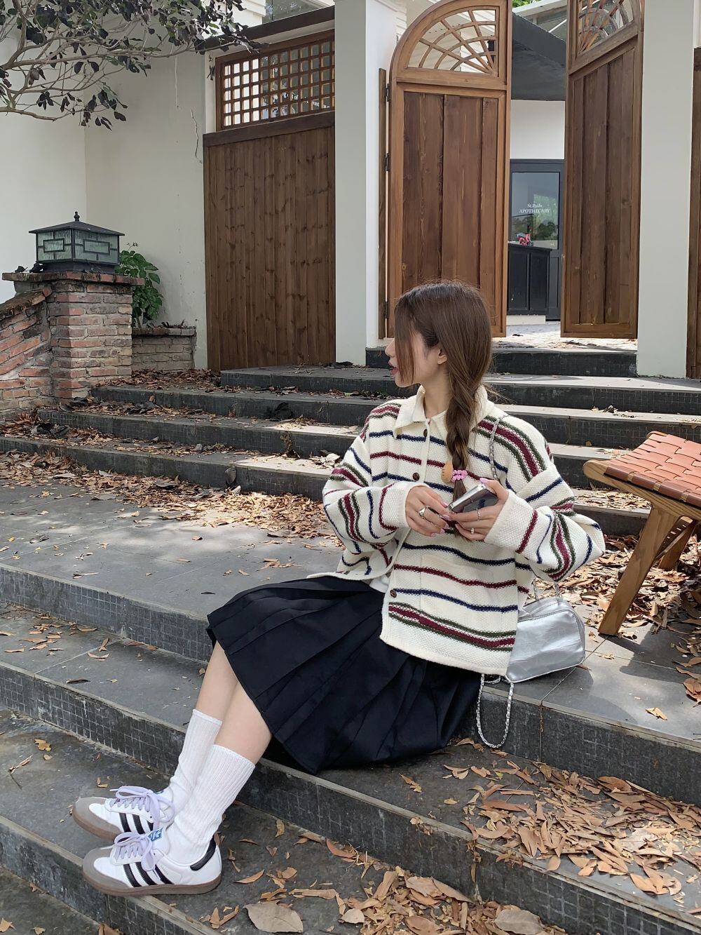 Gothiscyn 秋カーディガンストライプルーズリラックスポロネックスリムフィットニットカーディガンコート オータム 秋物