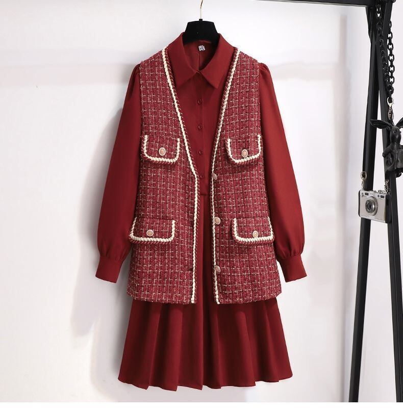 甘いホットガールスーツ春と秋ツイード V ネックベスト長袖スリムフィットドレス 2 点セット服 ロング 大人ガーリー スウィート キュート カジュアル スプリング 春物 オータム 秋物 Vネック