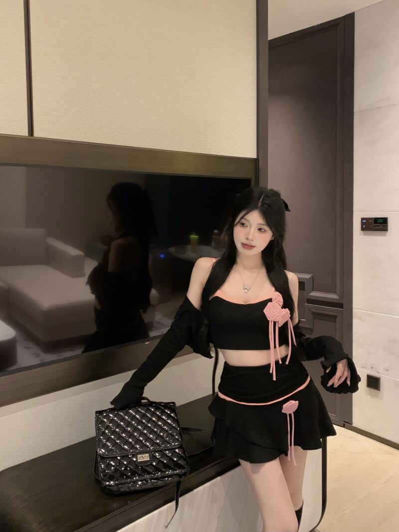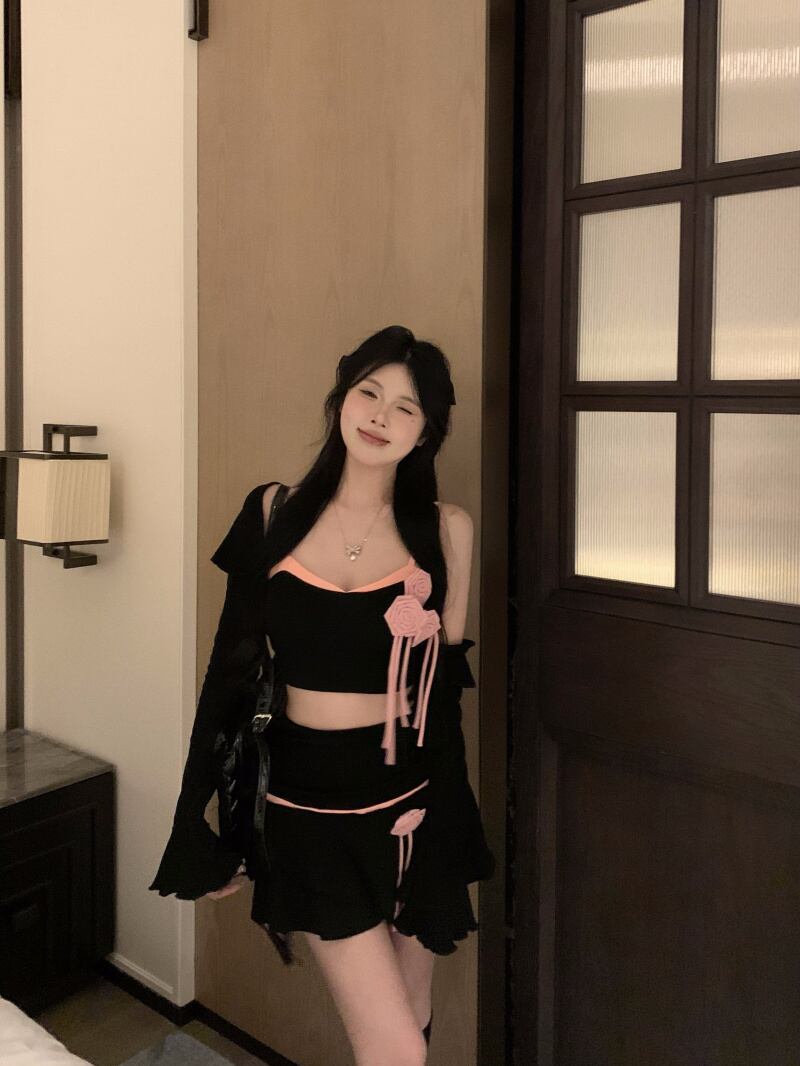 ホットガール純粋セクシースーツ夏ストラップショートトップカーディガンコートウエストミニスカート 3 点セット服 サマー 夏物 ピュア