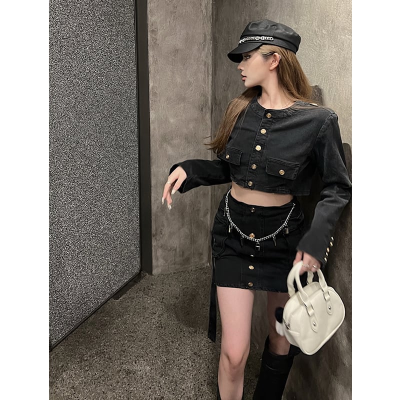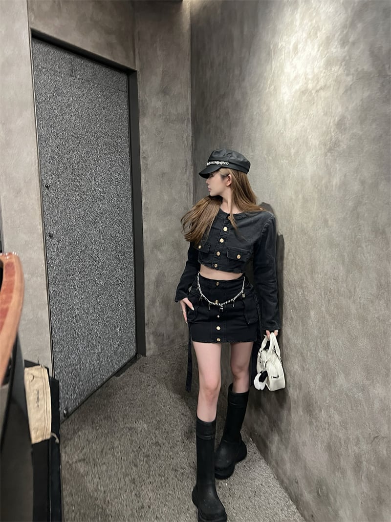 ホットガールデニムスーツ秋スリムフィットショート O ネックトップレトロウエストミニスカート 2 点セット服 オータム 秋物 Oネック