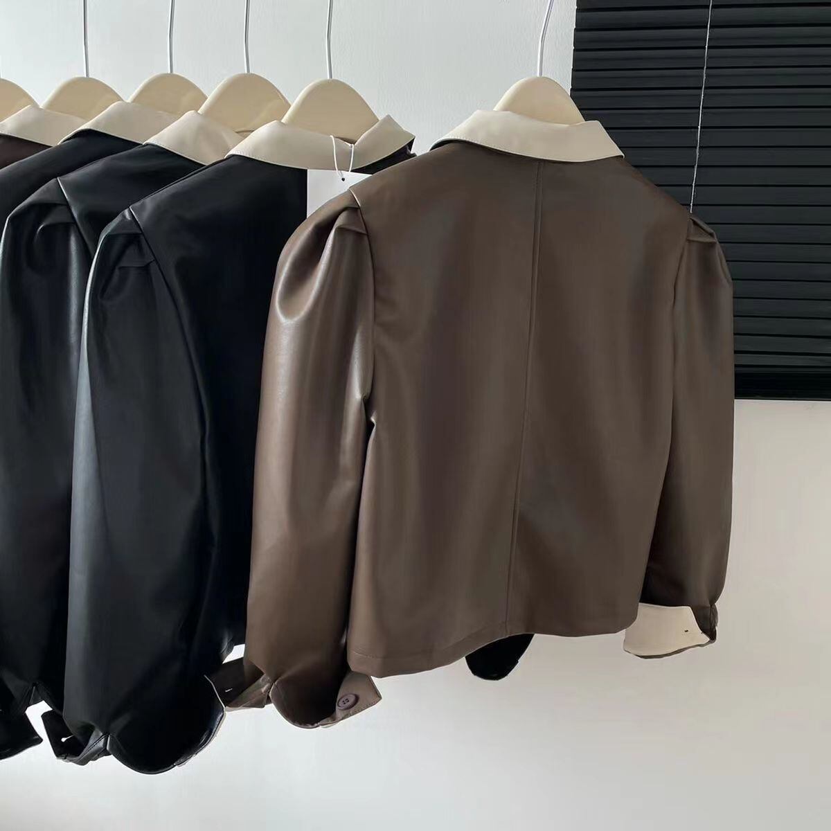 ターンダウン襟カラーレザーコート秋香港スタイルレトロ長袖ショートジャケットトップ服 ロング レッド オータム 秋物