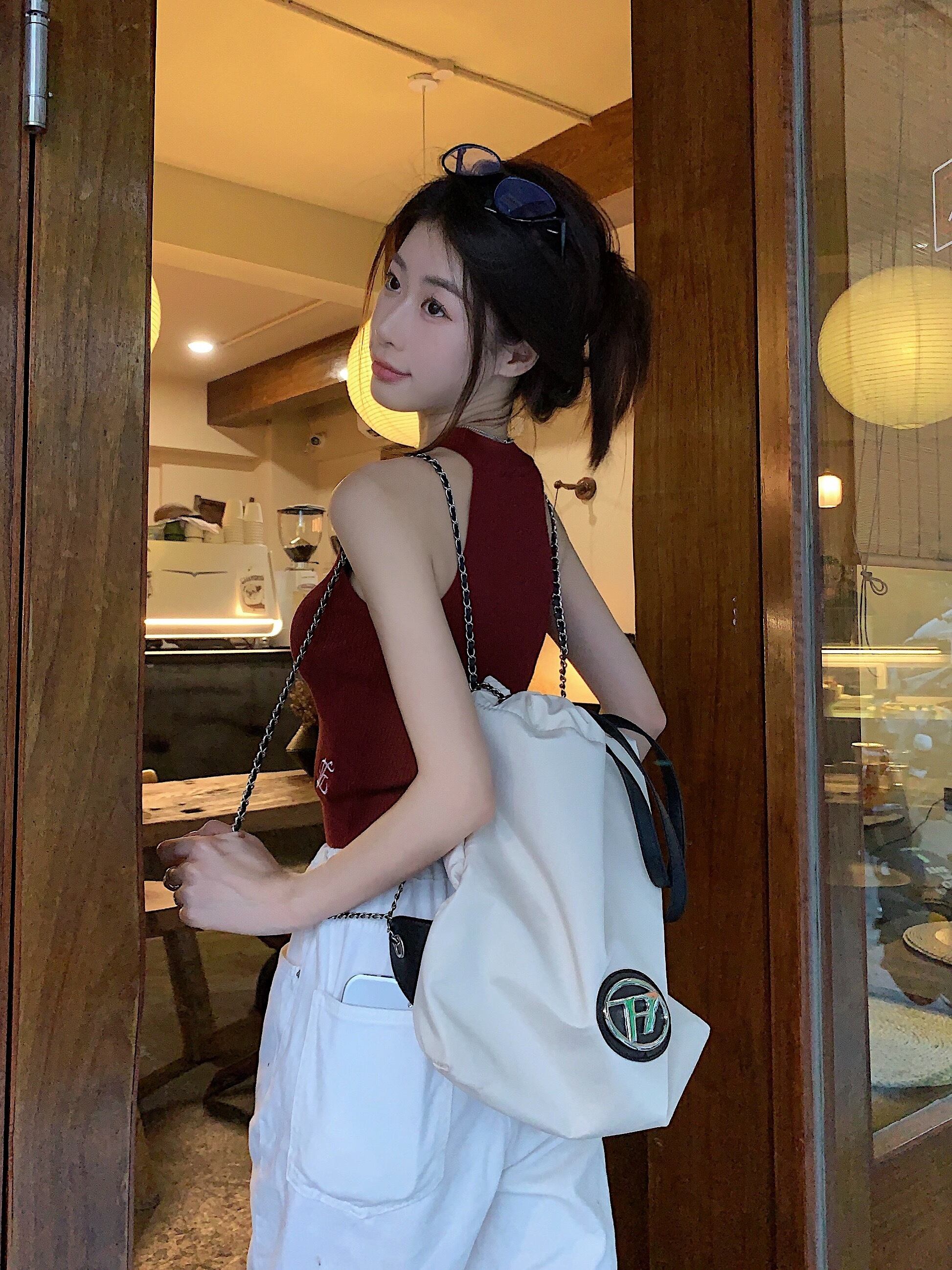 甘くてホット女子レトロホルターネックニットサスペンデッドタンクトップ夏バーガンディ刺繍スリムフィットショートトップ 大人ガーリー スウィート キュート カジュアル サマー 夏物